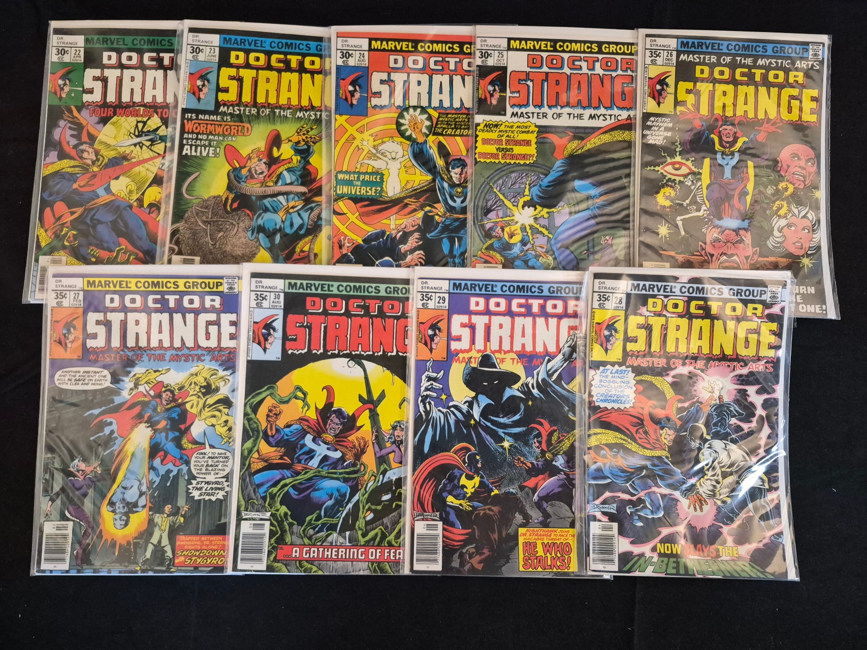 BID PER WHAT YOU SEE IN THE PHOTO, NOT THE AI GENERATED TITLES AND DESCRIPTIONS! This collection consists of Bronze Age comic books titled Doctor Strange: Master of the Mystic Arts, published by the Marvel Comics Group. The group includes various issues from the late 1970s. Each comic features color cover art illustrating the character in mystical scenarios. The publications are printed on newsprint and are individually housed in clear plastic protective sleeves. Original cover prices range from 30 to 35 cents.