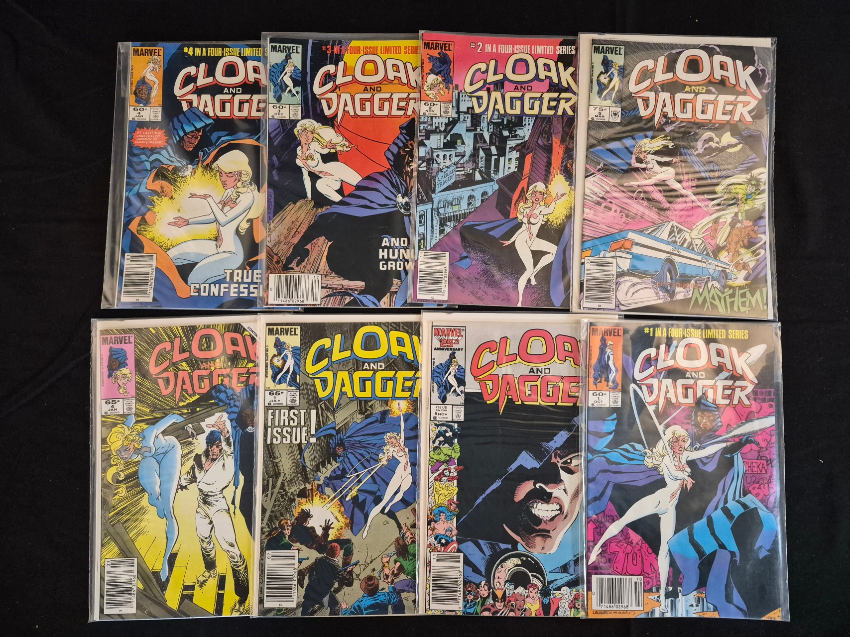 BID PER WHAT YOU SEE IN THE PHOTO, NOT THE AI GENERATED TITLES AND DESCRIPTIONS! This collection consists of several vintage Marvel comic books featuring the characters Cloak and Dagger. The group includes issues from the 1983 four-issue limited series, including issue numbers 1, 2, 3, and 4. Also included are issues from the subsequent 1985 ongoing series, featuring the designated First Issue (Vol. 2, #1), as well as issues 4, 5, and 9. The comics are printed on paper and are individually housed in protective clear plastic sleeves. The cover art is characteristic of the Copper Age of comics and displays the Marvel logo, issue numbers, and original retail prices ranging from $0.60 to $0.75.