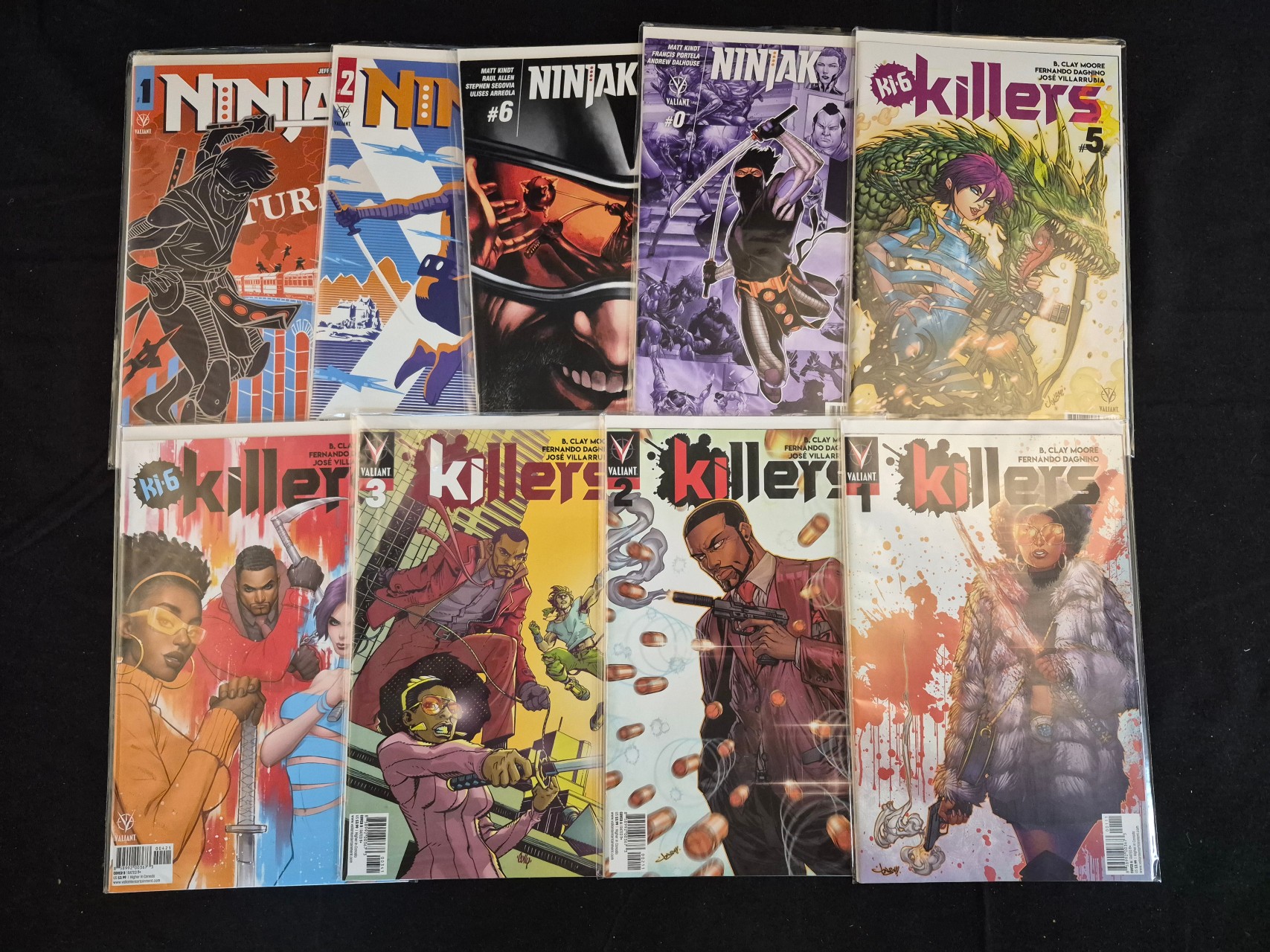 BID PER WHAT YOU SEE IN THE PHOTO, NOT THE AI GENERATED TITLES AND DESCRIPTIONS! A collection of contemporary American comic books published by Valiant Entertainment, featuring various issues from the Ninjak and Killers (Ki-6 Killers) series. The group includes Ninjak issues 0, 1, 2, and 6, and Killers issues 1, 2, 3, 4, and 5. These modern publications showcase stylized, full-color cover illustrations with credits for creators such as Matt Kindt, Jeff Lemire, B. Clay Moore, and Fernando Dagnino. The Killers series is identified as the 2019 run written by B. Clay Moore with art by Fernando Dagnino. Each comic is individually housed in a clear protective plastic sleeve with a backing board.