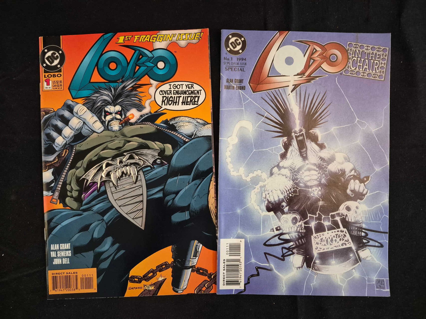 BID PER WHAT YOU SEE IN THE PHOTO, NOT THE AI GENERATED TITLES AND DESCRIPTIONS! This lot consists of two staple-bound comic books published by DC Comics featuring the character Lobo. The first issue is Lobo No. 1, dated December 1993, with creative credits to Alan Grant, Val Semeiks, and John Dell. The cover features an orange background with the text 1st Fraggin Issue! and a central illustration of the character. The second issue is Lobo: In the Chair No. 1, a 1994 special issue, with creative credits to Alan Grant and Martin Emond. This issue features a blue-toned cover illustration. Both publications include standard barcodes, publisher logos, and pricing information for US, Canadian, and UK markets on the front covers.