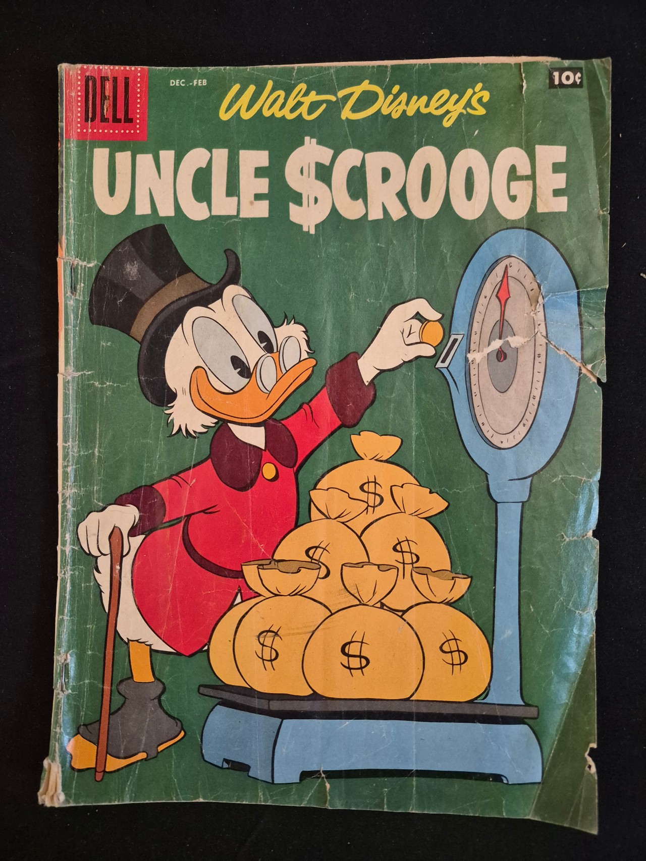 BID PER WHAT YOU SEE IN THE PHOTO, NOT THE AI GENERATED TITLES AND DESCRIPTIONS! Walt Disney’s Uncle Scrooge number 20, published by Dell Publishing in 1958. This issue features the story City of Golden Roofs with script and art by Carl Barks. The comic book is constructed of printed paper with a color cover illustration of Uncle Scrooge weighing bags of money on a blue scale against a green background. The cover includes a 10-cent price and a date line of DEC.-FEB.
