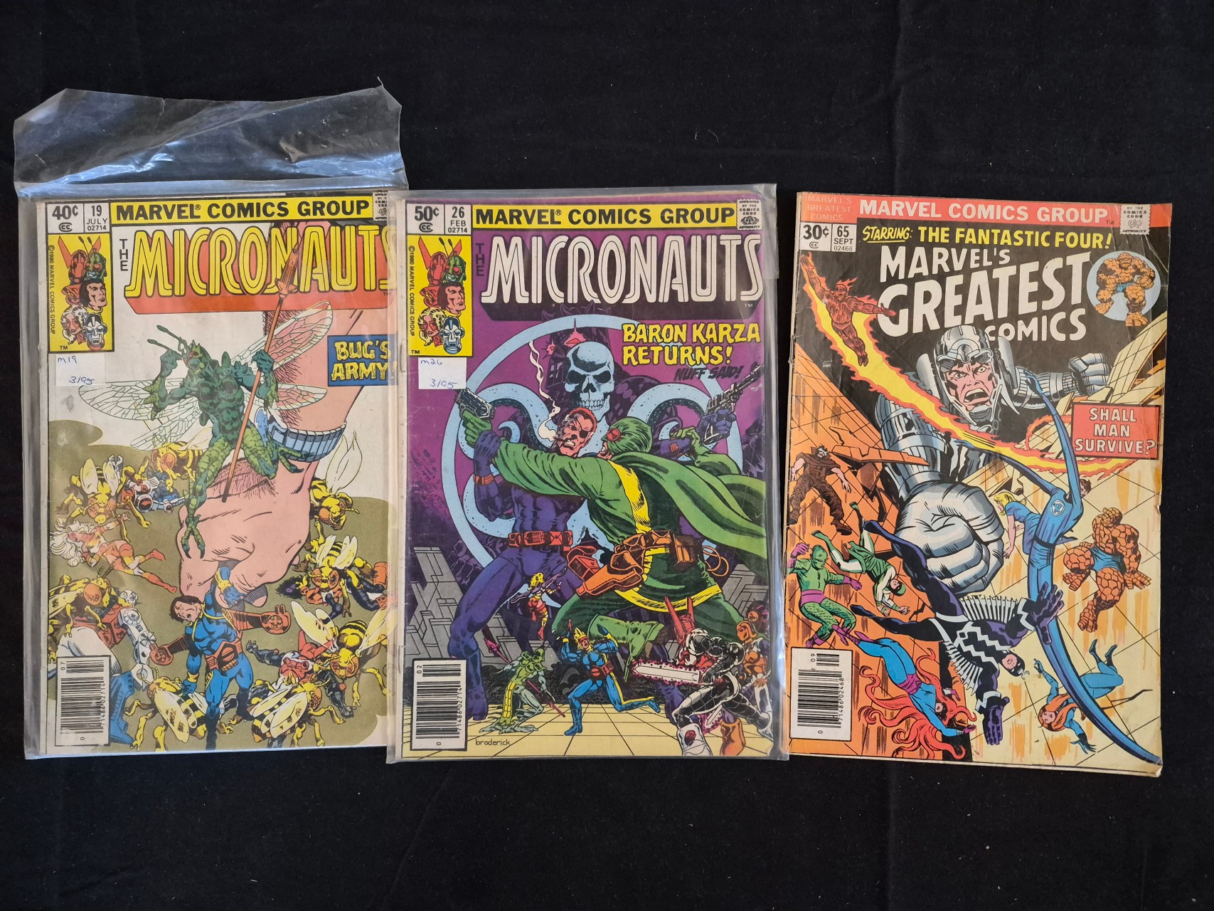 BID PER WHAT YOU SEE IN THE PHOTO, NOT THE AI GENERATED TITLES AND DESCRIPTIONS! A trio of Marvel Comics Group comic books from the Bronze Age era. The collection includes The Micronauts issue number 19 (July 1980), The Micronauts issue number 26 (February 1981), and Marvel’s Greatest Comics issue number 65 (September 1976) featuring the Fantastic Four. These items are printed on paper with stapled bindings. The Micronauts #26 is a Volume 1 issue from the 1979-1984 series. Each cover displays the original price, issue number, and date alongside characteristic Marvel graphics and typography. Two issues are contained within individual plastic protective sleeves.