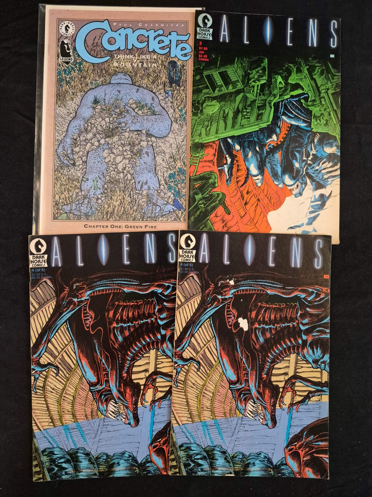 BID PER WHAT YOU SEE IN THE PHOTO, NOT THE AI GENERATED TITLES AND DESCRIPTIONS! A group of modern-age American comic books published by Dark Horse Comics. The lot includes Aliens issue number 3 (January 1989) and two copies of Aliens issue number 4 (1989) from the six-issue limited series by Mark Verheiden and Mark A. Nelson. Also included is Paul Chadwick’s Concrete: Think Like a Mountain, Chapter One: Green Fire. The items are printed on paper with color-illustrated covers. One book is presented in a protective plastic sleeve.