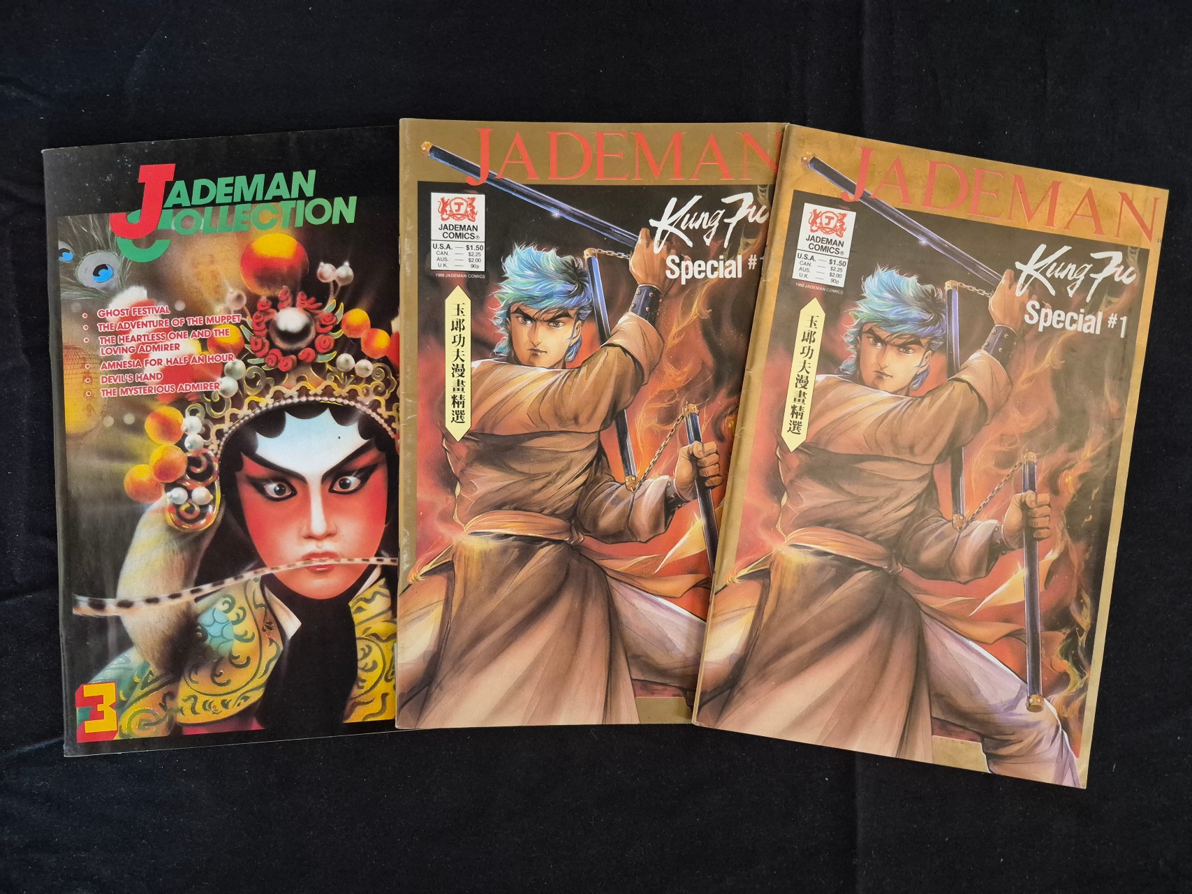BID PER WHAT YOU SEE IN THE PHOTO, NOT THE AI GENERATED TITLES AND DESCRIPTIONS! This group of vintage Jademan Comics from 1988 consists of two copies of Kung Fu Special No. 1 and one copy of Jademan Collection 3. These publications are printed on paper and represent the late 20th-century Hong Kong manhua style associated with publisher Tony Wong. The cover of Jademan Collection 3 depicts a figure in traditional Chinese opera attire and makeup, with story titles including Ghost Festival, The Adventure of the Muppet, The Heartless One and the Loving Admirer, Amnesia for Half an Hour, Devil’s Hand, and The Mysterious Admirer. The Kung Fu Special No. 1 covers feature a martial artist with blue hair holding a staff and nunchaku. Markings include the Jademan Comics logo, original price points for the U.S.A., Canada, Australia, and the U.K., and the Chinese text 玉郎功夫漫畫精選.