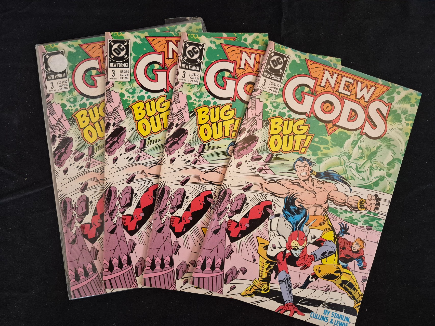 BID PER WHAT YOU SEE IN THE PHOTO, NOT THE AI GENERATED TITLES AND DESCRIPTIONS! A collection of DC Comics New Gods Vol. 3 issue number 3, published in April 1989. These Copper Age comic books feature the cover story titled BUG OUT! with credits for creators Starlin, Cullins, and Lewis. This issue is identified in market documentation as featuring a first appearance. The covers are printed with the NEW FORMAT banner and list original retail prices of US $1.50, CAN $1.85, and UK 80p. The items are staple-bound paper periodicals. The cover illustration depicts characters Orion and Forager in a combat scene.