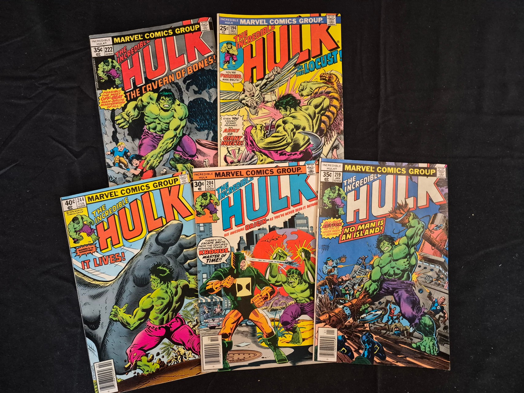 BID PER WHAT YOU SEE IN THE PHOTO, NOT THE AI GENERATED TITLES AND DESCRIPTIONS! A collection of several vintage Bronze Age comic books featuring The Incredible Hulk, published by the Marvel Comics Group. The issues date from the mid-1970s through 1980 and include visible issue numbers 194, 204, 219, 222, and 244. These paper-bound publications feature color illustrations on the covers with story titles such as The Cavern of Bones!, vs The Locust!, and No Man Is An Island!. Issue 204, published in 1976, is noted for the first appearance of Kronus. The covers include original newsstand prices ranging from 25 cents to 40 cents.