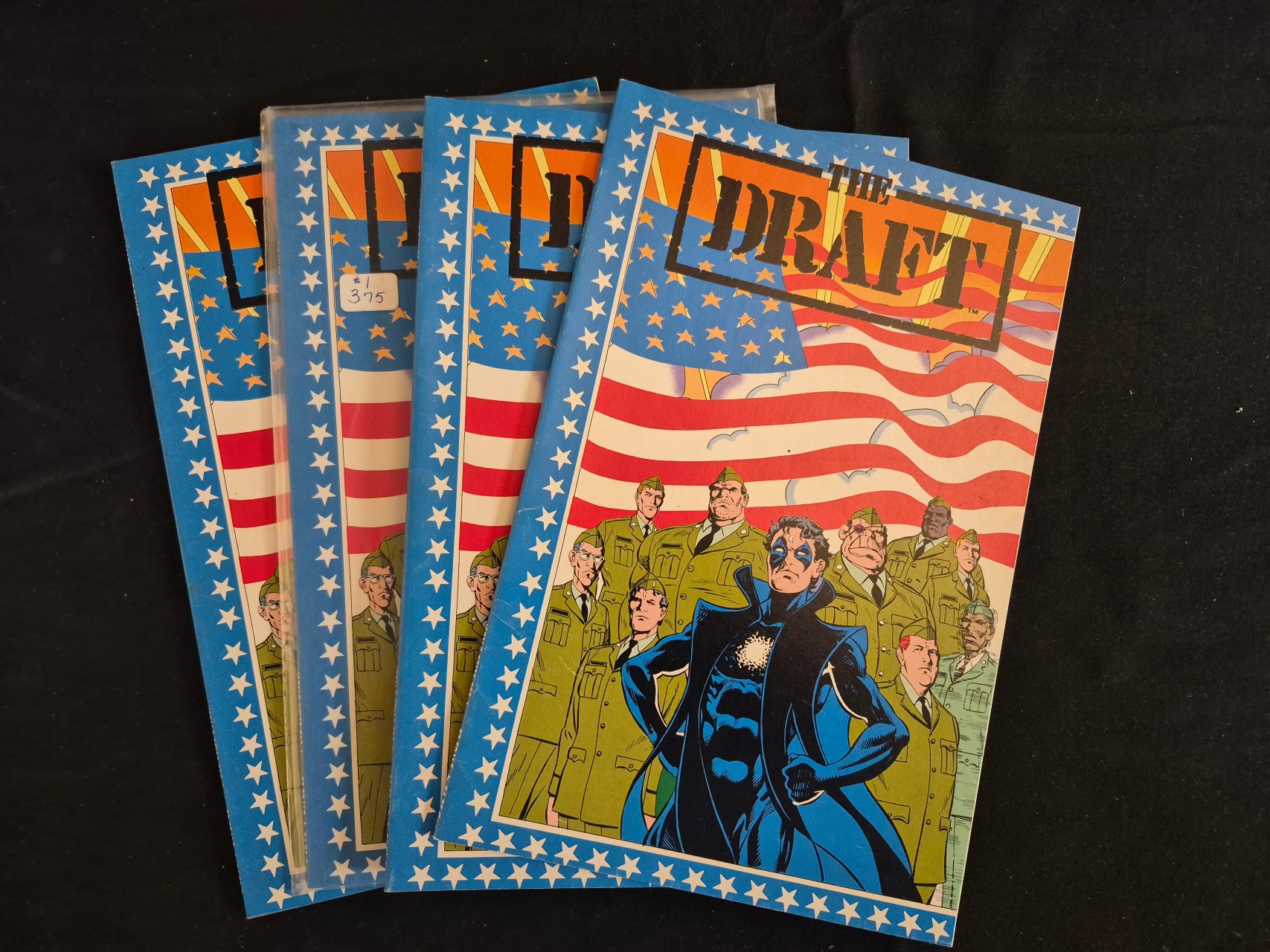 BID PER WHAT YOU SEE IN THE PHOTO, NOT THE AI GENERATED TITLES AND DESCRIPTIONS! A group of modern-era comic books titled The Draft 1, published by Marvel Comics in 1988. This issue is a one-shot publication featuring the first appearance of several characters. The cover art depicts a central costumed figure in blue and black attire positioned in front of a group of uniformed military personnel, set against a background of the American flag with a blue star-patterned border. The credits for this issue include writers Mark Gruenwald and Fabian Nicieza. The lot consists of several copies of the same issue.