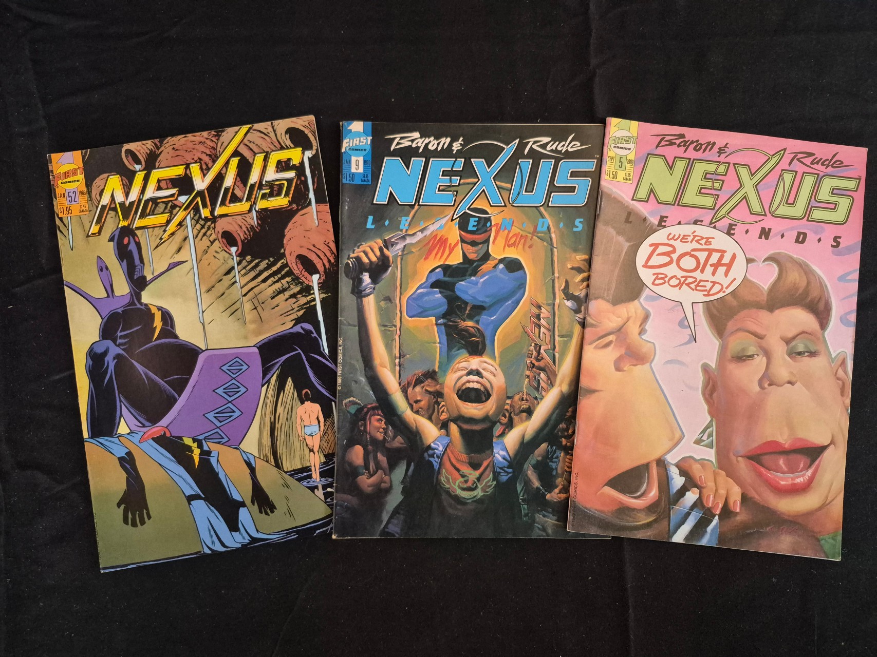 BID PER WHAT YOU SEE IN THE PHOTO, NOT THE AI GENERATED TITLES AND DESCRIPTIONS! This trio of First Comics publications features the series Nexus and Nexus Legends, created by Mike Baron and Steve Rude. The collection includes Nexus issue 52 (January 1989), Nexus Legends issue 5 (September 1989), and Nexus Legends issue 9 (January 1990). Each comic is a standard format Modern Age issue with full-color cover art and interior pages. The covers display issue numbers, dates, and original retail prices between $1.50 and $1.95.