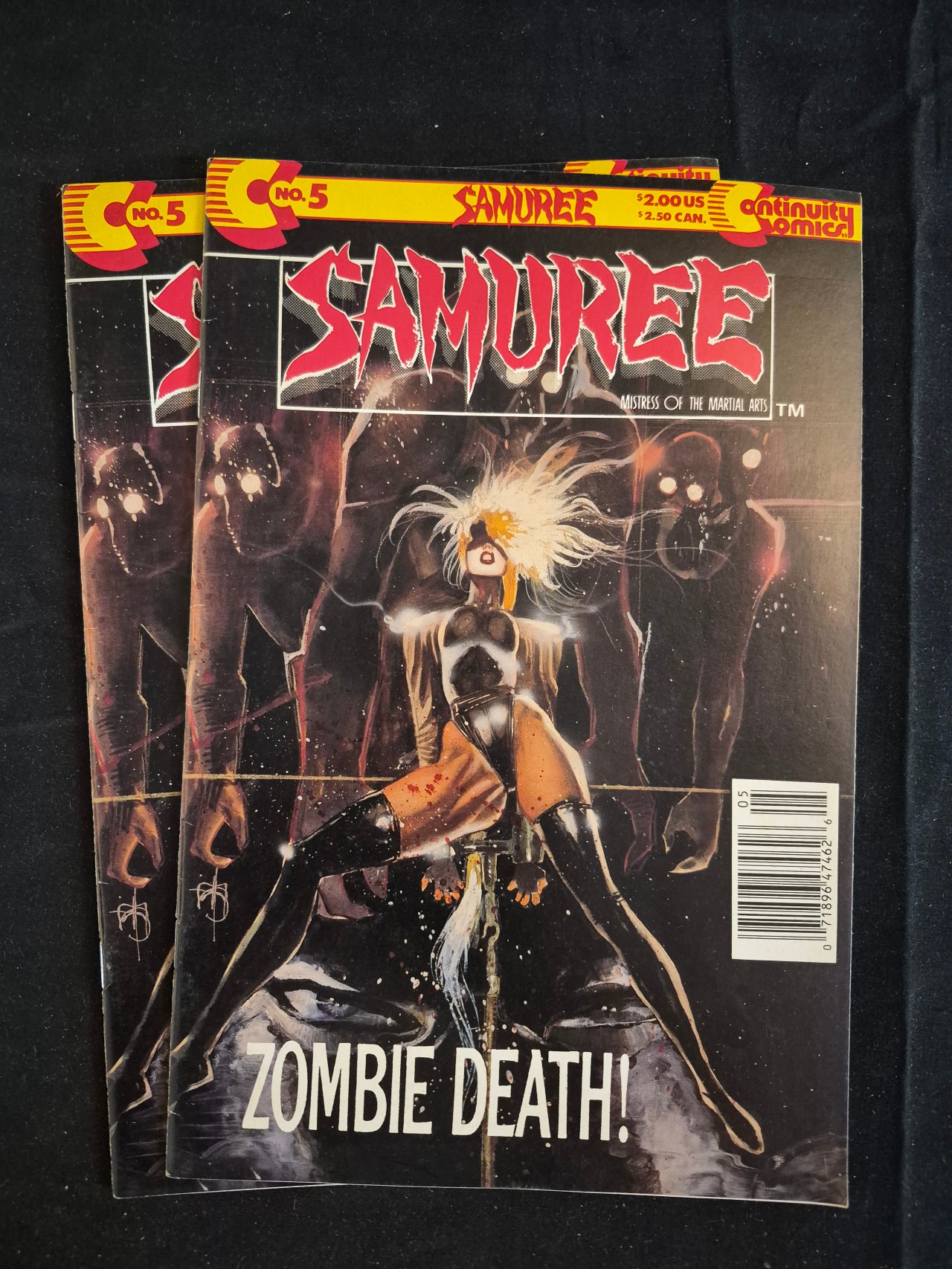 BID PER WHAT YOU SEE IN THE PHOTO, NOT THE AI GENERATED TITLES AND DESCRIPTIONS! A collection of several copies of the comic book Samuree: Mistress of the Martial Arts, issue number 5, published by Continuity Comics. These modern age publications feature cover art with the title Samuree in red stylized lettering and the headline Zombie Death! at the bottom. The front covers display a price of 2.00 US and 2.50 CAN along with a standard UPC barcode. The publisher logo for Continuity Comics is located in the upper corners of the covers. The items are constructed of standard comic book paper with stapled spines.