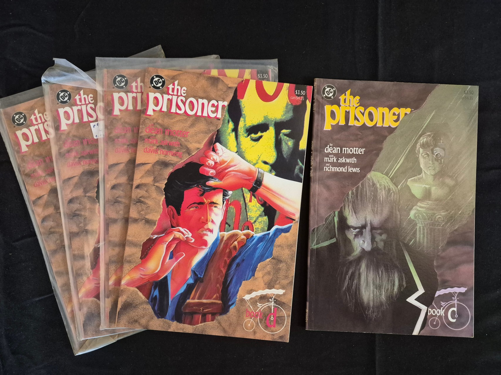 BID PER WHAT YOU SEE IN THE PHOTO, NOT THE AI GENERATED TITLES AND DESCRIPTIONS! A collection of graphic novels from The Prisoner series published by DC Comics circa 1988 to 1989. The series features writing and art by Dean Motter, Mark Askwith, David Hornung, and Richmond Lewis. This lot includes multiple copies of Book A and Book C. Each volume features stylized multi-tonal illustrative cover art and a listed original cover price of $3.50 USD. The books are constructed with standard comic paper and cardstock covers.