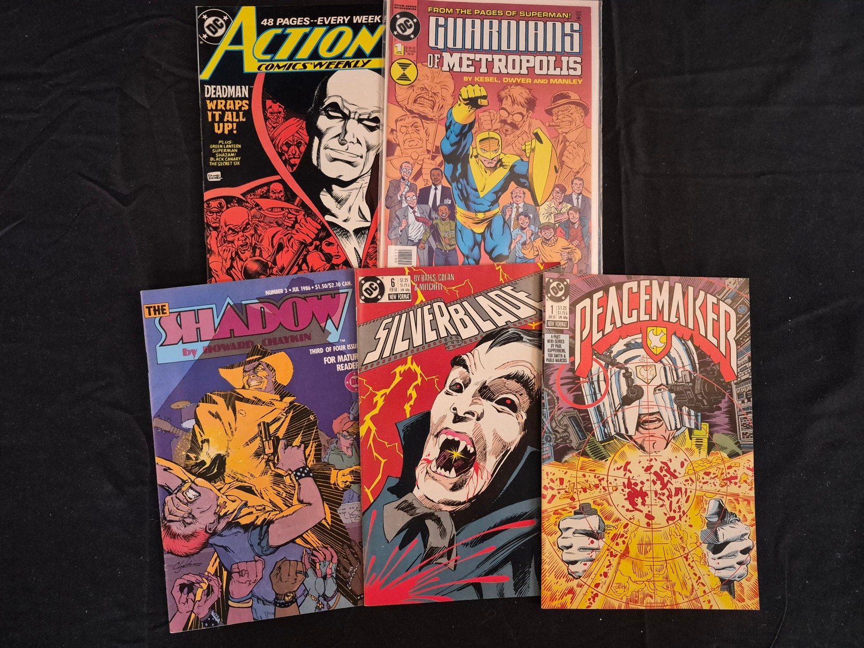 BID PER WHAT YOU SEE IN THE PHOTO, NOT THE AI GENERATED TITLES AND DESCRIPTIONS! A collection of DC Comics comic books from the mid-to-late 1980s. The group includes Action Comics Weekly featuring Deadman, Guardians of Metropolis issue 1, Howard Chaykin’s The Shadow issue 3 (July 1986), Silverblade issue 6 (February 1988), and Peacemaker issue 1 (January 1988). Silverblade issue 6 features credits for Cary Bates and Gene Colan. The publications consist of illustrated color covers on paper and cardstock.