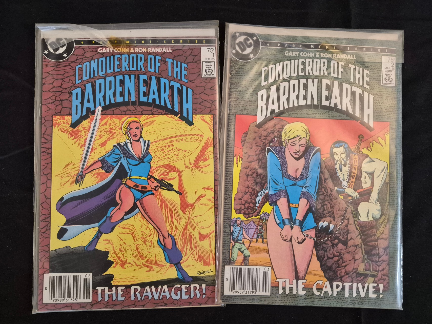BID PER WHAT YOU SEE IN THE PHOTO, NOT THE AI GENERATED TITLES AND DESCRIPTIONS! A pair of DC comic books from the 1985 series titled Conqueror of the Barren Earth. The lot includes issue number 1, dated February and subtitled The Ravager!, and issue number 2, dated March and subtitled The Captive!. Both issues are written by Gary Cohn with illustrations by Ron Randall. Each cover features the original 75-cent price, the Comics Code Authority seal, and a 4-part mini-series banner. The comics are printed in full color and are housed in clear protective plastic sleeves.