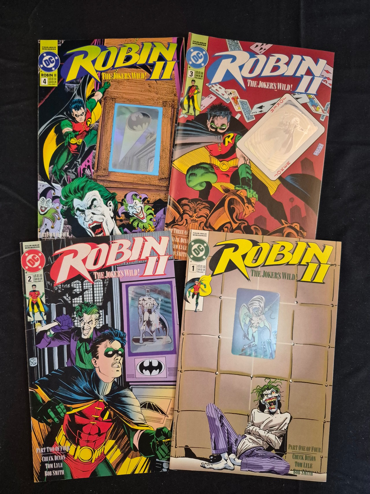 BID PER WHAT YOU SEE IN THE PHOTO, NOT THE AI GENERATED TITLES AND DESCRIPTIONS! This set of DC Comics features the four-issue miniseries Robin II: The Joker’s Wild! published in 1991. The collection includes the complete sequence of issues from part one through part four. Each issue identifies the creative team of Chuck Dixon, Tom Lyle, and Bob Smith on the front cover. The cover art is characteristic of the early 1990s, featuring dynamic illustrations of the characters Robin and the Joker. Several issues in this set feature a central holographic or metallic foil insert integrated into the cover design. The publications are standard format comic books with glossy covers and vibrant color printing.