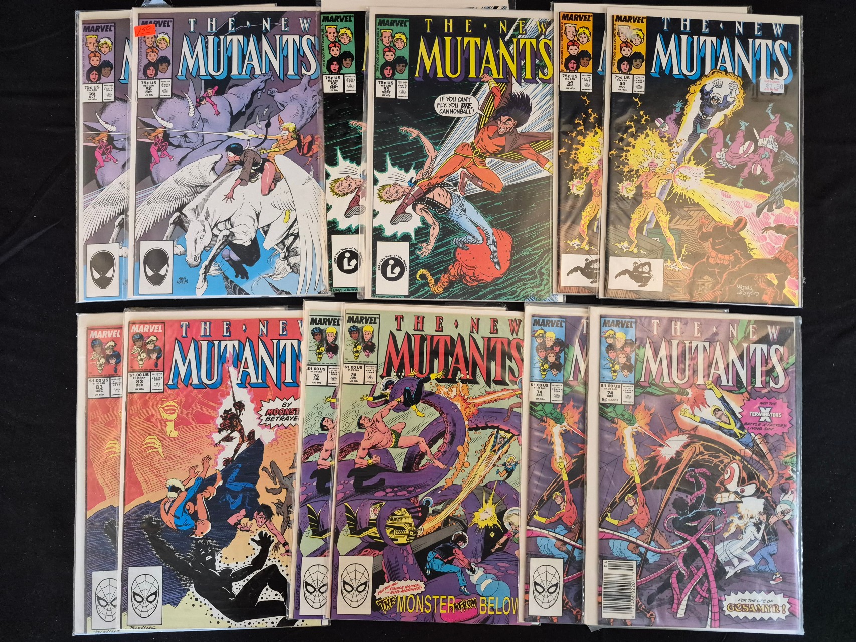 BID PER WHAT YOU SEE IN THE PHOTO, NOT THE AI GENERATED TITLES AND DESCRIPTIONS! A collection of Marvel Comics The New Mutants series comic books, dating from the late 1980s. The group includes various issues such as numbers 54, 55, 56, 74, 76, and 83, with several duplicate copies present. The comics are color-printed on paper and feature cover art by illustrators including Bret Blevins and Mike Mignola. Each individual issue is housed in a clear protective plastic sleeve with a white backing board.