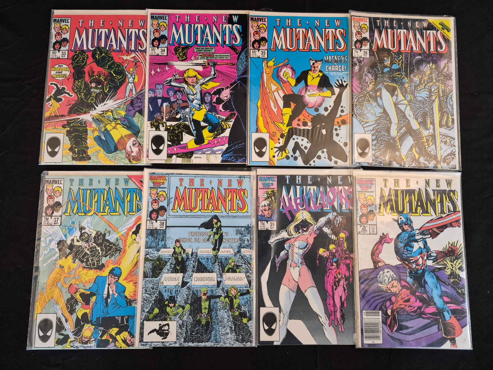 BID PER WHAT YOU SEE IN THE PHOTO, NOT THE AI GENERATED TITLES AND DESCRIPTIONS! Marvel The New Mutants comic books, presented as a collection of issues ranging from 33 to 40. These publications date to the mid-1980s and represent the transition from the Bronze Age to the Modern Age of comics. Each issue is individually housed in a transparent plastic sleeve with a white backing board. The covers display the Marvel logo, issue numbers, and original newsstand prices ranging from 65 cents to 75 cents. Featured characters include Magik and Magneto, with one cover depicting a guest appearance by Captain America. The illustrations are printed in color on paper.