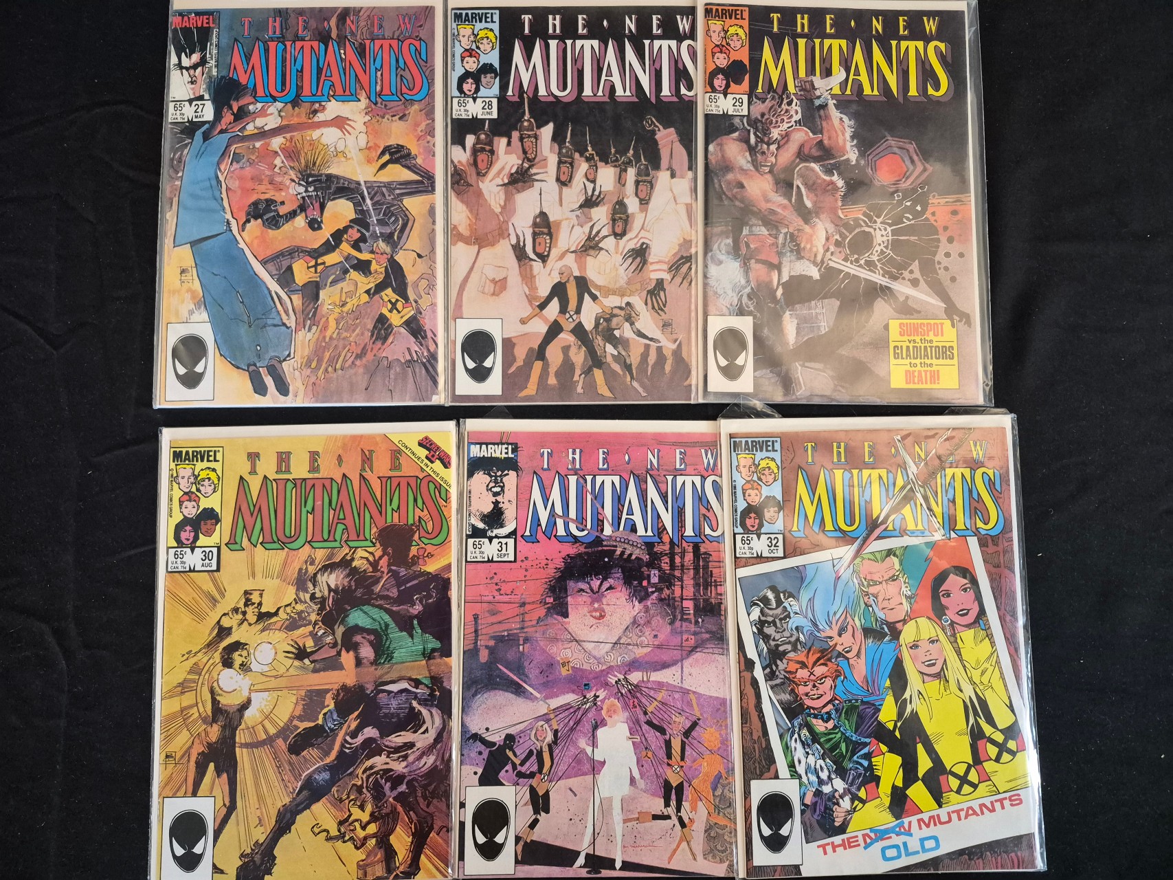 BID PER WHAT YOU SEE IN THE PHOTO, NOT THE AI GENERATED TITLES AND DESCRIPTIONS! This collection consists of multiple issues of The New Mutants comic book series published by Marvel Comics in 1985. The group includes issues 27, 28, 29, 30, 31, and 32, featuring cover dates ranging from May to October. Each issue displays the distinctive cover art of Bill Sienkiewicz. The comics are printed with the standard 65-cent price point and period-appropriate Marvel branding. Issue 29 includes a cover teaser for Sunspot vs. the Gladiators. Each comic is individually housed in a clear protective plastic sleeve.