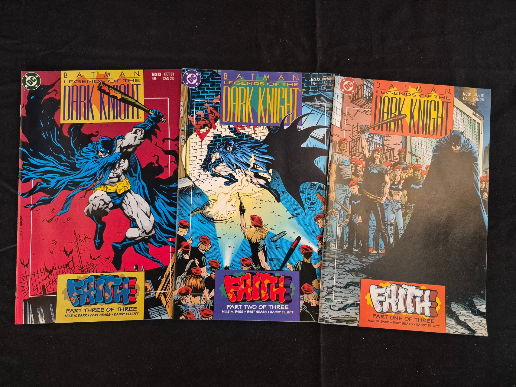 BID PER WHAT YOU SEE IN THE PHOTO, NOT THE AI GENERATED TITLES AND DESCRIPTIONS! A trio of DC comic books from the Batman: Legends of the Dark Knight series, comprising the complete three-part Faith story arc. The lot includes Issue No. 21 (August 1991), Issue No. 22 (September 1991), and Issue No. 23 (October 1991). Creative credits for these issues are attributed to Mike W. Barr, Bart Sears, and Randy Elliott. Each comic displays full-color illustrated cover art and includes the DC circular logo and original pricing information in the top corners. The issues are part of the first series of this title.