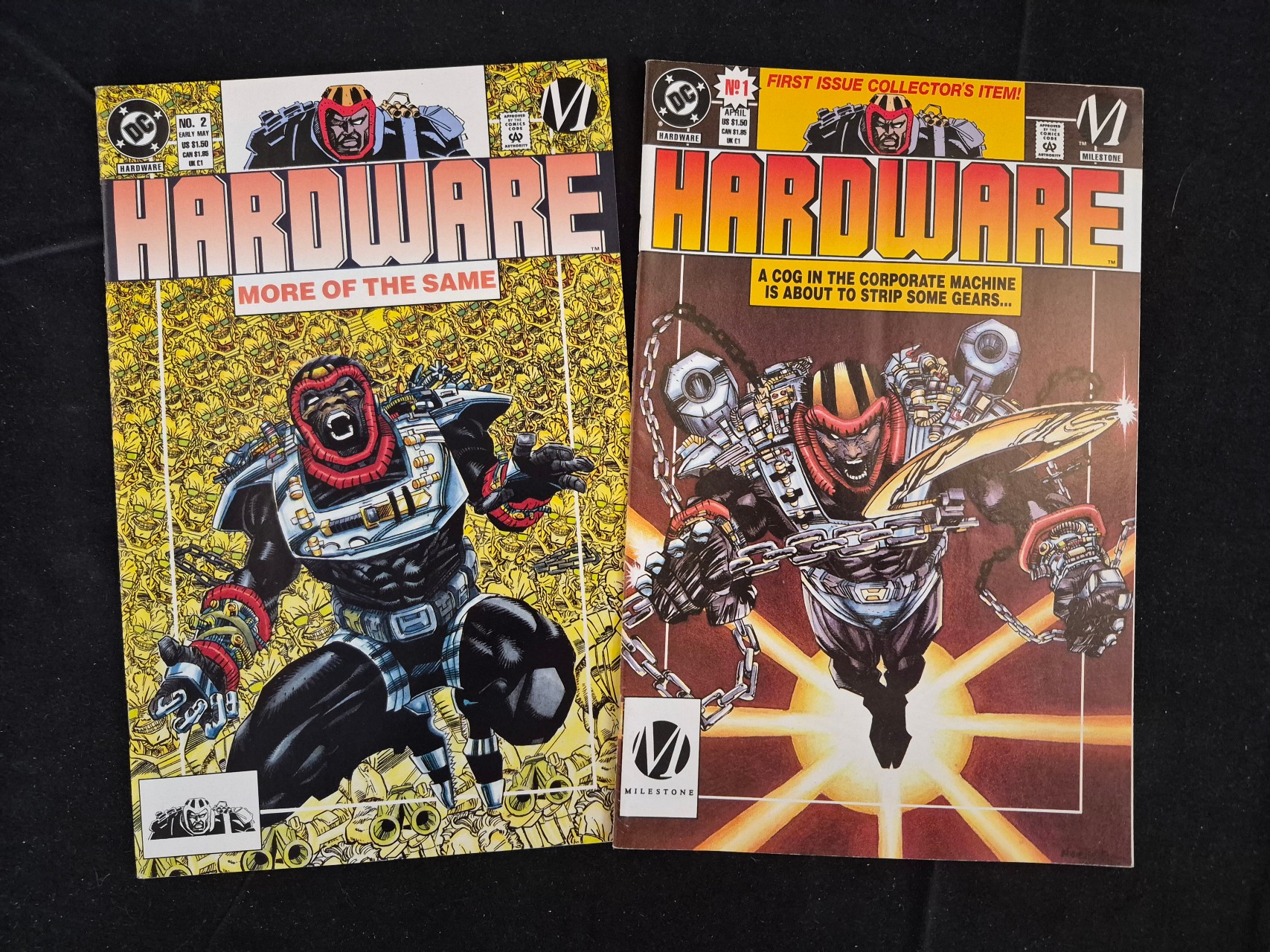 BID PER WHAT YOU SEE IN THE PHOTO, NOT THE AI GENERATED TITLES AND DESCRIPTIONS! A pair of vintage comic books from the Hardware series, published by DC Comics under the Milestone imprint in 1993. The lot includes Issue No. 1, dated April and designated as a First Issue Collector’s Item, and Issue No. 2, dated Early May with the tagline More of the Same. These issues were created by Dwayne McDuffie and Denys Cowan. Each book features a gloss-finished cover with dynamic superhero illustrations. Visible markings include the Hardware title, DC and Milestone logos, pricing information for US, Canada, and UK, and the Comics Code Authority seal. The interiors are printed on standard comic book paper.