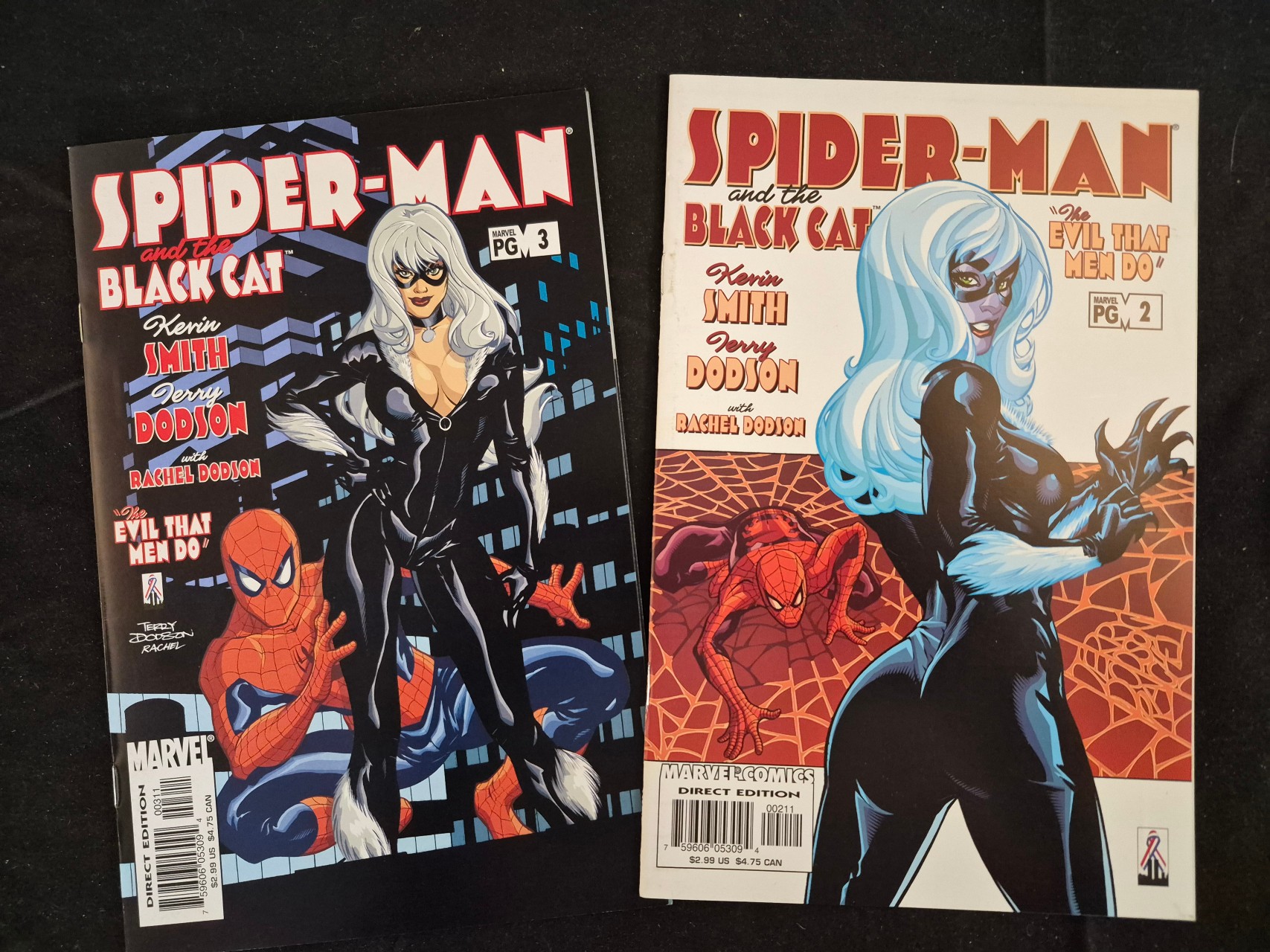 BID PER WHAT YOU SEE IN THE PHOTO, NOT THE AI GENERATED TITLES AND DESCRIPTIONS! A pair of modern age comic books from the Marvel series Spider-Man and the Black Cat: The Evil That Men Do, specifically issues #2 and #3. These staple-bound paper publications, published in 2002, feature writing by Kevin Smith and artwork by Terry and Rachel Dodson. Issue #2 includes the first appearance of the character Francis Klum. Each cover displays the series title, creator credits, the Marvel Comics logo, and a PG rating. The publications are standard-sized comic books with color illustrations throughout.