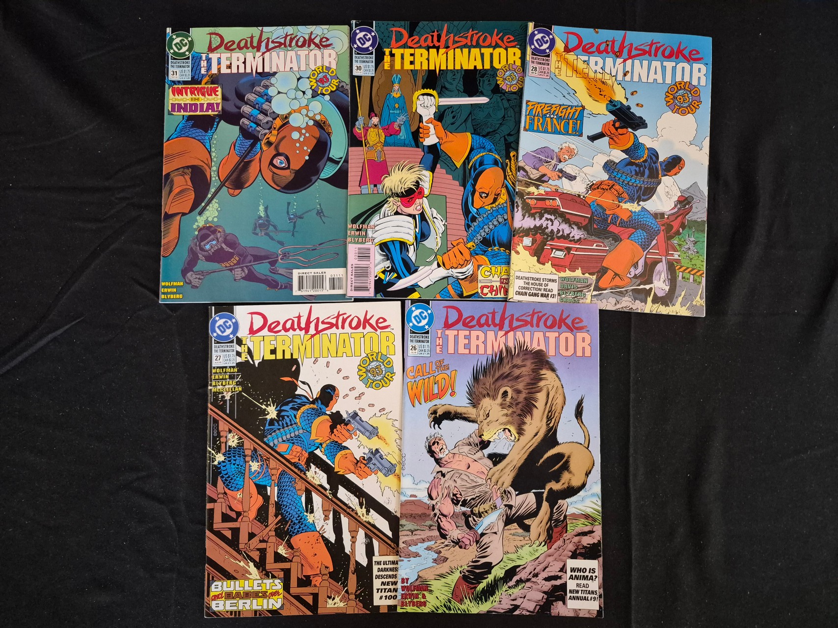 BID PER WHAT YOU SEE IN THE PHOTO, NOT THE AI GENERATED TITLES AND DESCRIPTIONS! A collection of DC Comics Deathstroke the Terminator comic books from the World Tour 93 story arc, published in 1993. The group includes multiple issues featuring cover titles such as Call of the Wild!, Bullets and Babes over Berlin, Firefight France!, Chaos in China!, and Intrigue in India!. These Modern Age periodicals are paper-based with color graphic illustrations. Credits on the covers include writer Marv Wolfman and artists Steve Erwin and Will Blyberg. Each issue displays the DC Comics logo, original pricing, barcodes, and issue numbers including 26, 27, 28, 30, and 31.