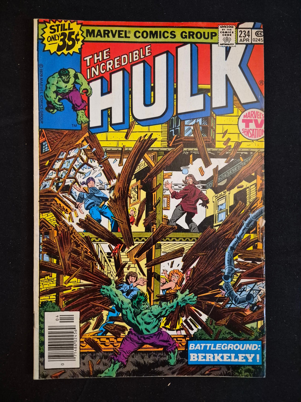BID PER WHAT YOU SEE IN THE PHOTO, NOT THE AI GENERATED TITLES AND DESCRIPTIONS! This is a single comic book issue of The Incredible Hulk, number 234, published by the Marvel Comics Group and dated April 1979. Market consensus identifies this issue as the first appearance of the character Quasar, who previously appeared as Marvel Man. The story is titled Battleground: Berkeley! and features cover art signed by Milgrom depicting the Hulk tearing through a wooden building. The cover includes a 35-cent price point, the Comics Code Authority seal of approval, and a circular promotional badge reading Marvel’s TV Sensation. A standard UPC barcode is visible in the lower-left corner. The publication is constructed with a gloss-finish paper cover and standard newsprint interior pages.