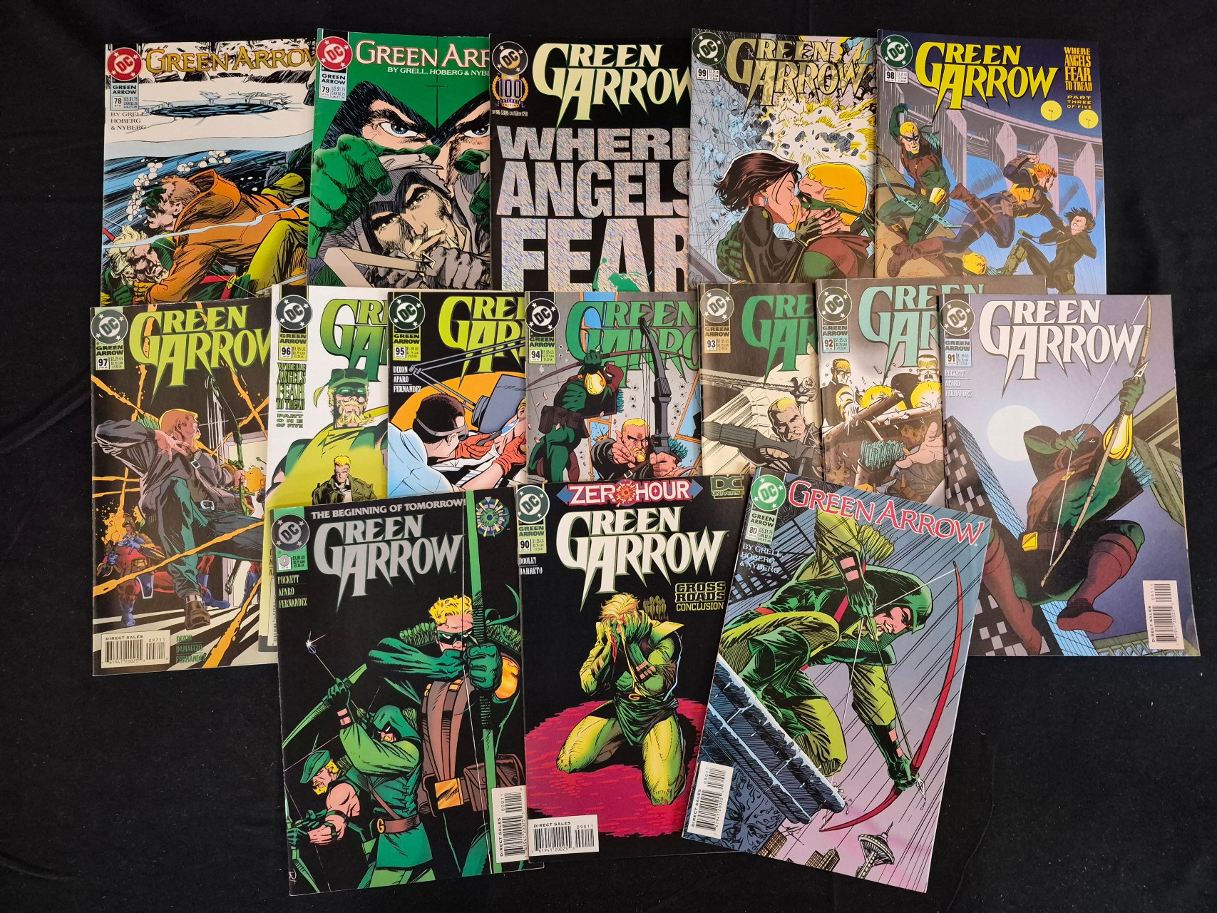 BID PER WHAT YOU SEE IN THE PHOTO, NOT THE AI GENERATED TITLES AND DESCRIPTIONS! This collection comprises multiple modern-age comic books from the DC Comics Green Arrow series, primarily published between 1993 and 1995. The group includes various issue numbers ranging from 78 to 100, featuring specific storylines such as Zero Hour, The Beginning of Tomorrow!, and Where Angels Fear to Tread. The publications include issue 0 and issue 100. Creative credits visible on the covers include Mike Grell, Chuck Dixon, Jim Aparo, and Rick Hoberg. Each book features standard DC Comics branding, including logos, issue numbers, price points, and direct sales barcodes. The items are printed on standard comic book paper with color-illustrated covers characteristic of the 1990s aesthetic.