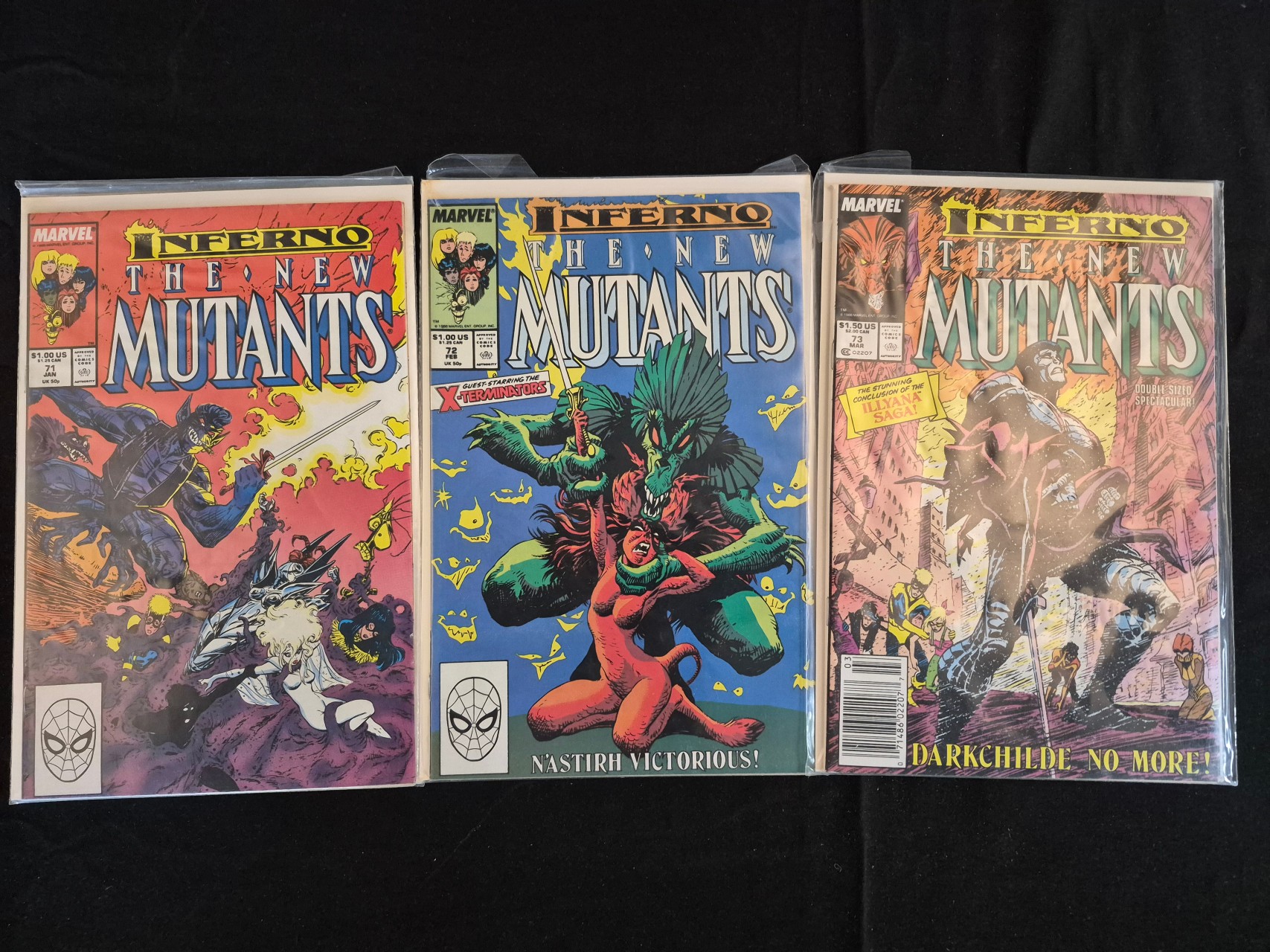 BID PER WHAT YOU SEE IN THE PHOTO, NOT THE AI GENERATED TITLES AND DESCRIPTIONS! A trio of Bronze Age comic books from the Marvel Comics series The New Mutants, comprising issue numbers 71, 72, and 73. These issues form part of the Inferno crossover event published in 1989. Issue 71 is dated January, issue 72 is dated February, and issue 73 is dated March. The covers display original price markings of $1.00 for issues 71 and 72, and $1.50 for issue 73. Narrative taglines include NASTIRH VICTORIOUS! and DARKCHILDE NO MORE!. The comics are printed on paper and housed in individual clear plastic protective sleeves with backing boards.