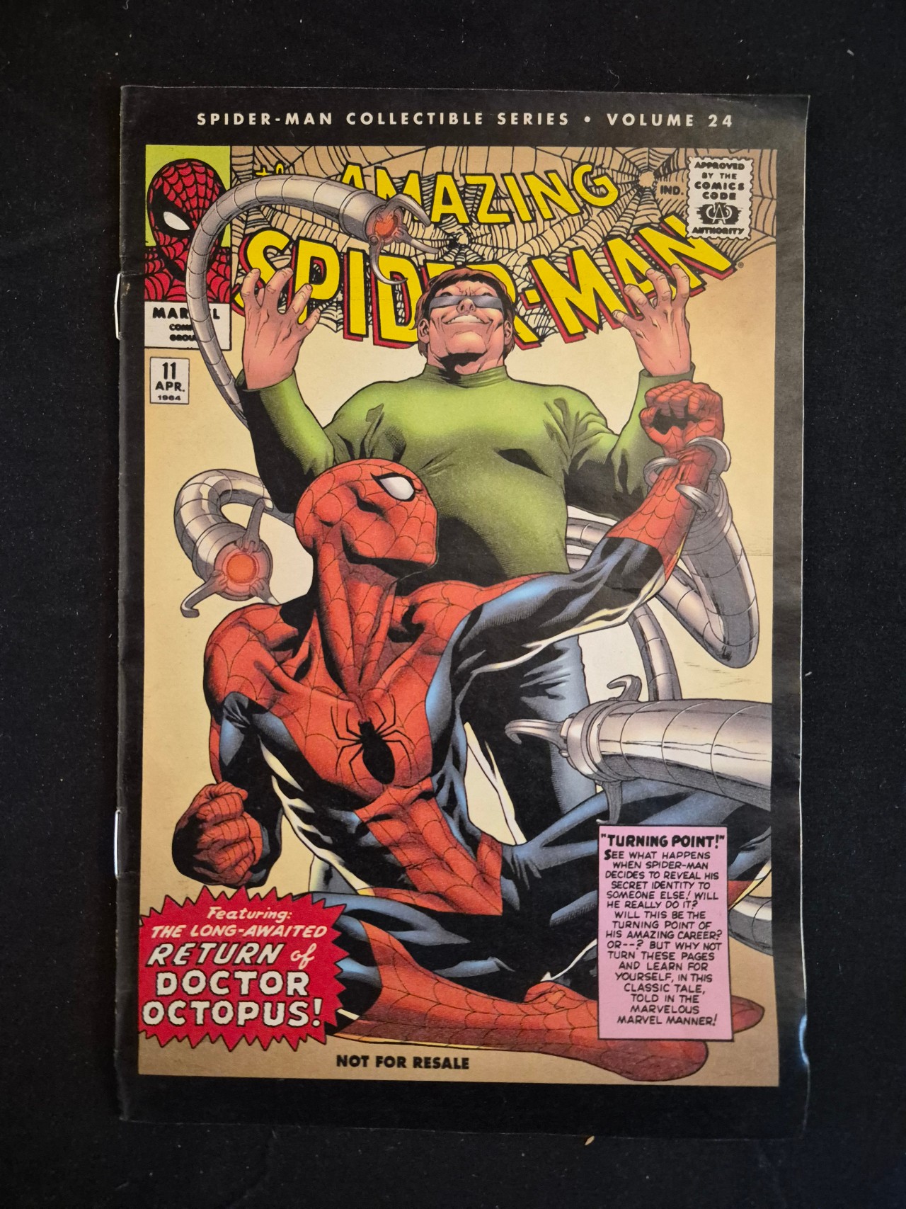 BID PER WHAT YOU SEE IN THE PHOTO, NOT THE AI GENERATED TITLES AND DESCRIPTIONS! This comic book is a modern promotional reprint from the Marvel Spider-Man Collectible Series, specifically identified as Volume 24. The publication reprints the content of The Amazing Spider-Man issue number 11, which was originally dated April 1964. The cover art depicts Spider-Man in a struggle with Doctor Octopus and includes prominent text stating The Long-Awaited Return of Doctor Octopus! along with a descriptive text box titled Turning Point!. The bottom edge of the front cover is marked Not For Resale. The item features the Comics Code Authority seal and Marvel Comics Group branding. The comic is composed of printed paper with a stapled spine.