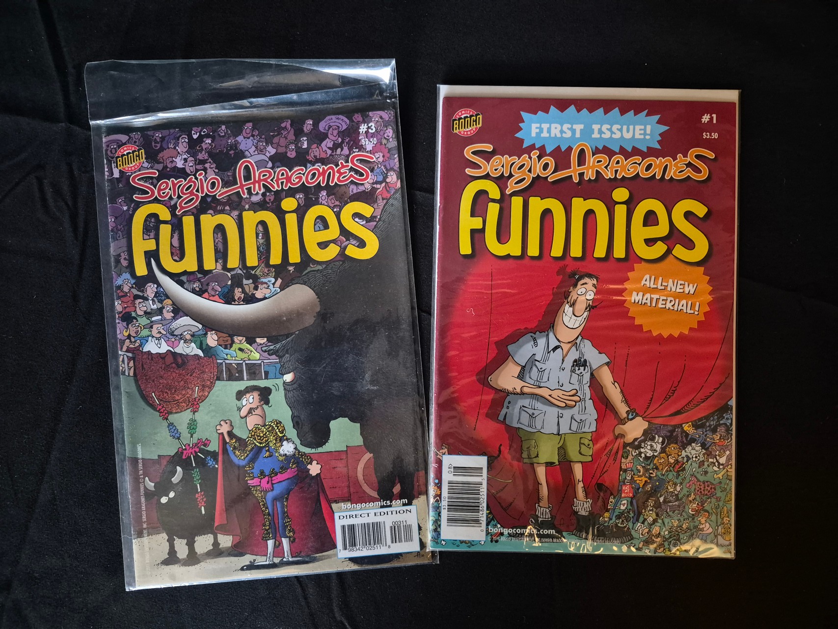BID PER WHAT YOU SEE IN THE PHOTO, NOT THE AI GENERATED TITLES AND DESCRIPTIONS! A pair of contemporary comic books from the series Sergio Aragones Funnies, published by the Bongo Comics Group. This lot includes issue number 1, featuring a red cover with a self-caricature of the artist and the text First Issue and All-New Material, and issue number 3, depicting a bullfighting scene with a large bull horn in the foreground and a matador. Both issues are marked with a 3.50 dollar price point and a Direct Edition barcode. The publications are printed on paper and feature the artist characteristic detailed illustration style.