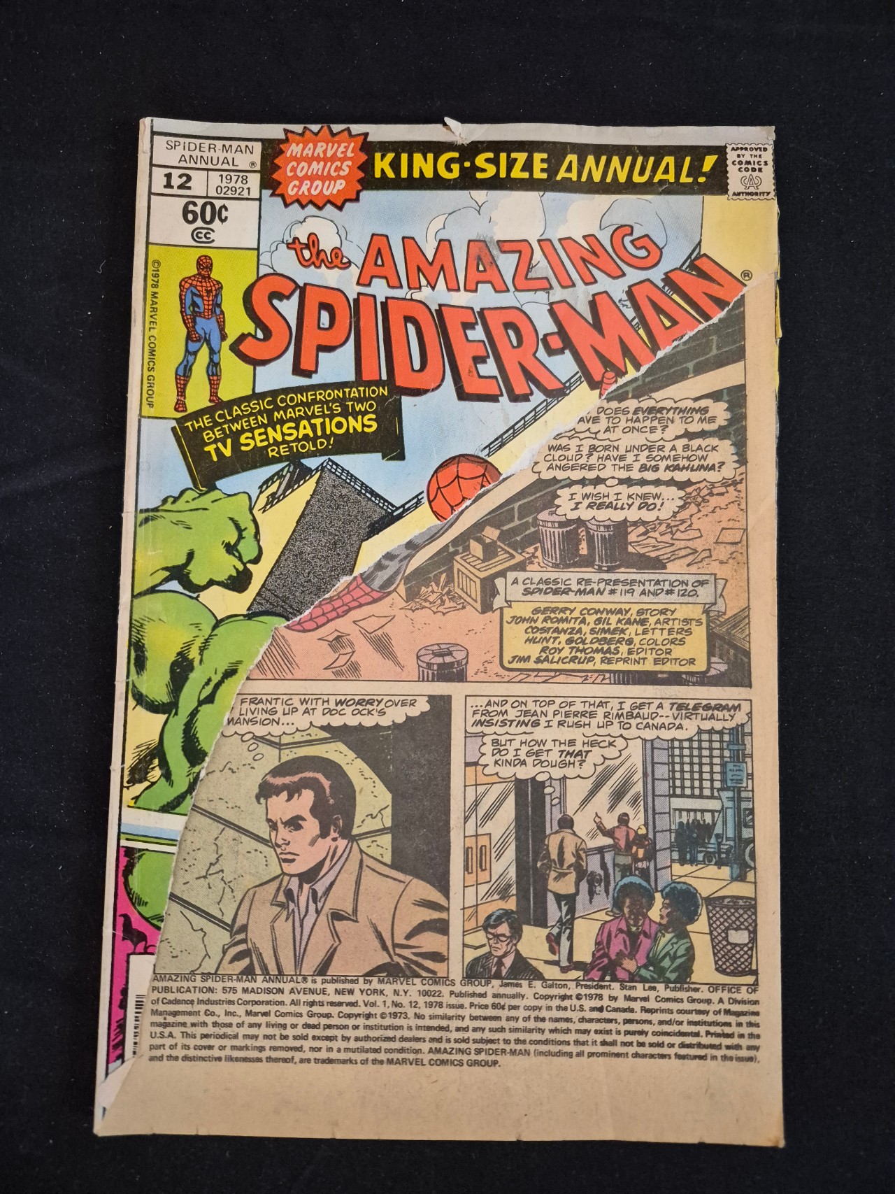 BID PER WHAT YOU SEE IN THE PHOTO, NOT THE AI GENERATED TITLES AND DESCRIPTIONS! A Bronze Age comic book titled The Amazing Spider-Man King-Size Annual #12, published by Marvel Comics Group in 1978. The paper cover features the Marvel Comics Group logo, a 60 cent price, and the Comics Code Authority seal. The cover art depicts Spider-Man and the Hulk, with text announcing a retelling of a confrontation between the characters. The issue contains a re-presentation of stories from The Amazing Spider-Man issues 119 and 120. Credits are listed for Gerry Conway for the story and John Romita and Gil Kane for the art. The publication indicia at the bottom of the cover identifies the issue as Vol. 1, No. 12, 1978.
