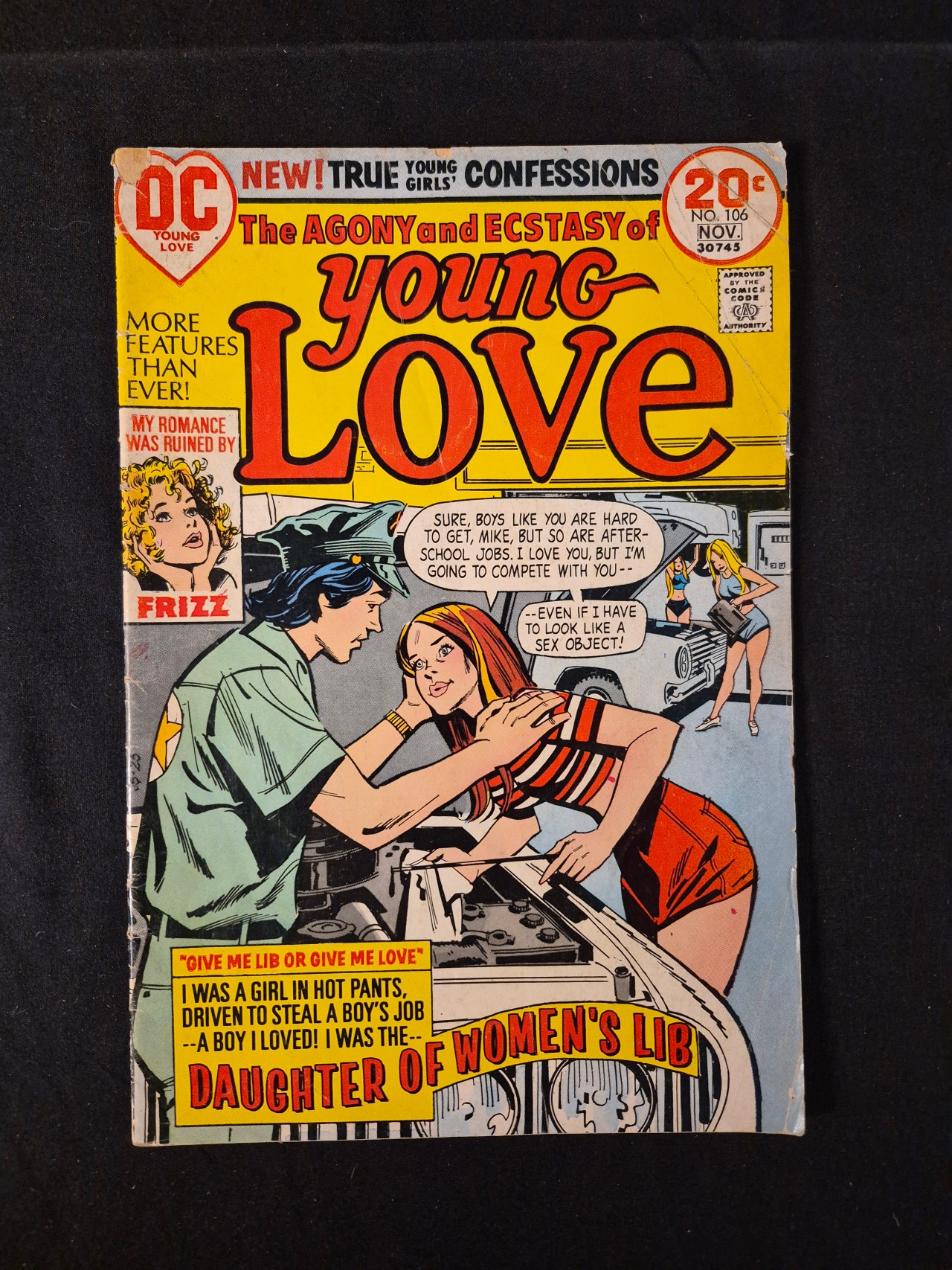 BID PER WHAT YOU SEE IN THE PHOTO, NOT THE AI GENERATED TITLES AND DESCRIPTIONS! This Bronze Age comic book, published by DC Comics, is titled Young Love, issue number 106, dated November 1973. The cover features the headline story Daughter of Women’s Lib and a secondary feature titled Frizz. The primary illustration depicts a young couple in an automotive setting with dialogue balloons. The cover includes the DC Young Love logo, the 20-cent price point, the serial number 30745, and the Approved by the Comics Code Authority seal. This paper-based publication is part of the DC romance line.