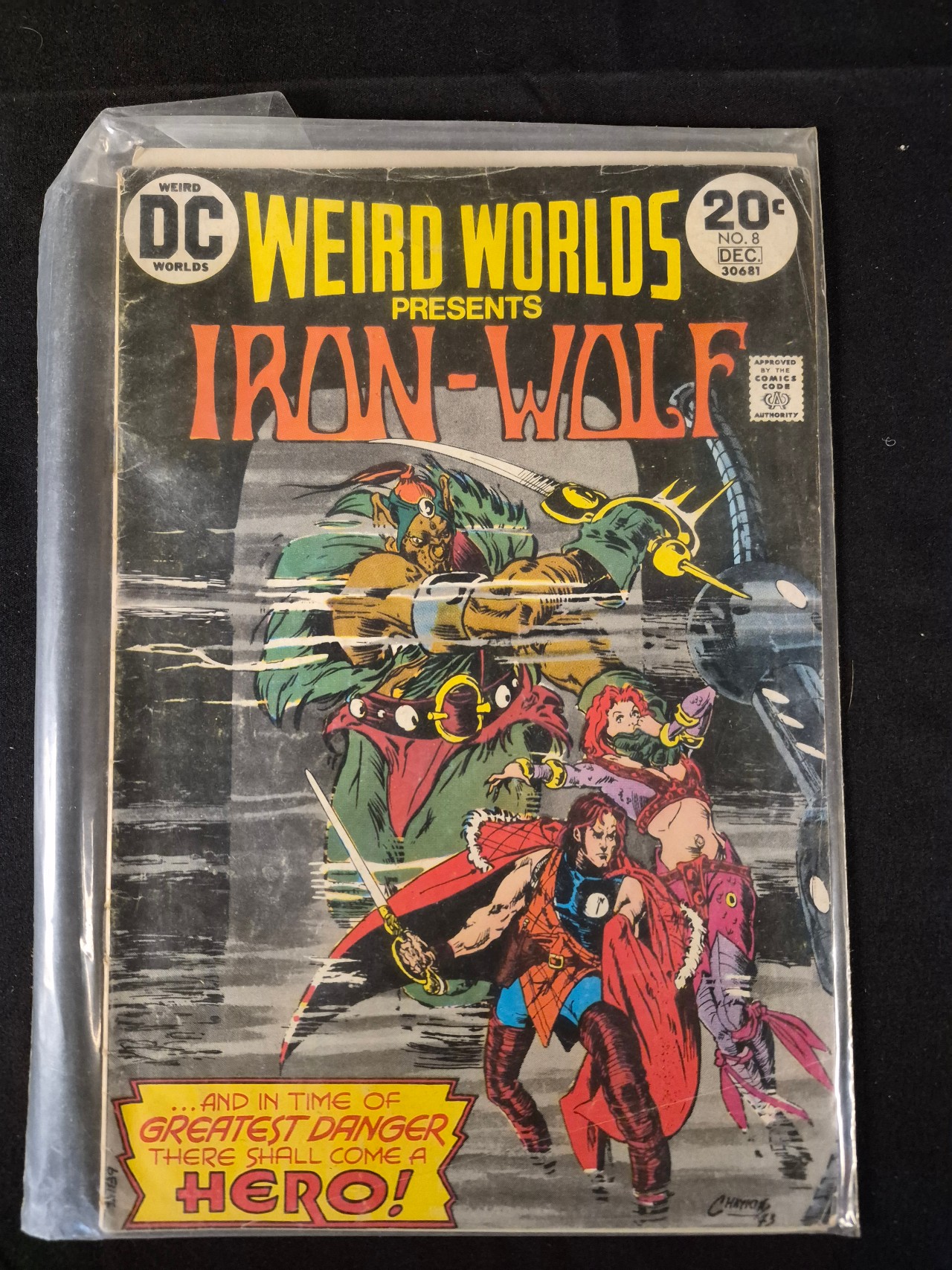 BID PER WHAT YOU SEE IN THE PHOTO, NOT THE AI GENERATED TITLES AND DESCRIPTIONS! This is a single issue of the DC Comics series Weird Worlds, issue number 8, dated December 1973. Based on market consensus, this issue features the first appearance of the characters Iron-Wolf and Shebaba O’Neal. The cover illustration is by artist Howard Chaykin and bears a signature and date of 73 in the lower right corner. The front cover displays the title Weird Worlds presents Iron-Wolf, a 20-cent cover price, the Comics Code Authority seal, and a caption at the bottom reading …AND IN TIME OF GREATEST DANGER THERE SHALL COME A HERO! The comic is a printed paper publication.