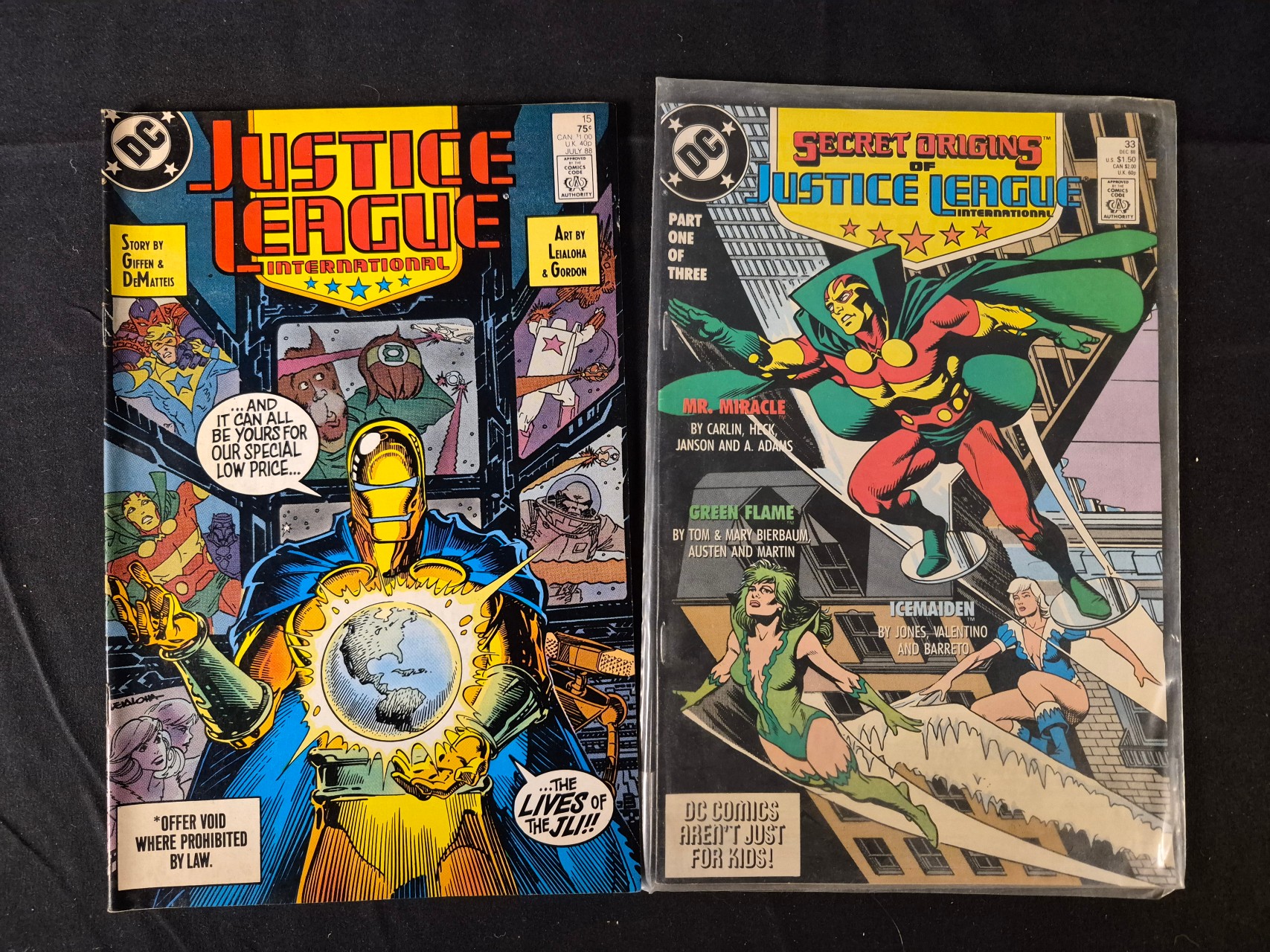 BID PER WHAT YOU SEE IN THE PHOTO, NOT THE AI GENERATED TITLES AND DESCRIPTIONS! Two vintage DC comic books from 1988. The first is Justice League International issue number 15, dated July 1988, with story credits to Giffen and DeMatteis and art by Leialoha and Gordon. The second is Secret Origins issue number 33, dated December 1988, featuring the origin of the Justice League International with characters including Mister Miracle, Green Flame, and Icemaiden. Both items are standard-format periodicals printed on paper with stapled bindings. One comic is housed in a protective plastic sleeve.