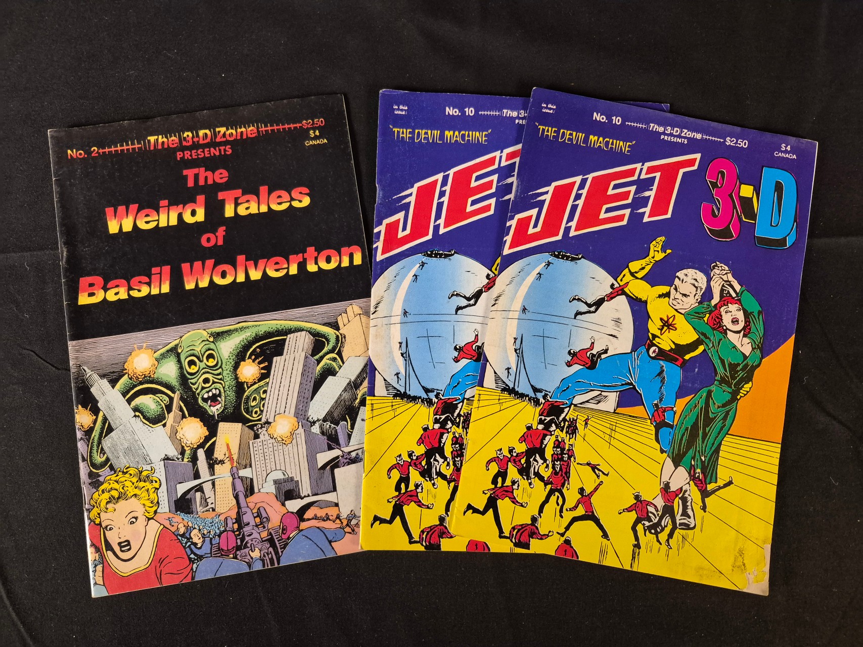 BID PER WHAT YOU SEE IN THE PHOTO, NOT THE AI GENERATED TITLES AND DESCRIPTIONS! This trio consists of vintage science fiction and horror-themed comic books from The 3-D Zone series, featuring late 20th-century 3-D reprints of classic material. The group includes The Weird Tales of Basil Wolverton (Issue No. 2) and two copies of JET 3-D (Issue No. 10) titled The Devil Machine. These publications are stapled paper booklets with color-printed pulpy cover illustrations. Issue No. 10 features artwork attributed to Bob Powell and was originally published circa February 1988. Each cover displays original retail pricing of $2.50 USD and $4.00 CAD.