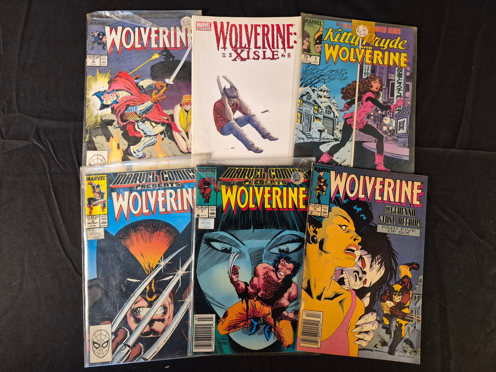 BID PER WHAT YOU SEE IN THE PHOTO, NOT THE AI GENERATED TITLES AND DESCRIPTIONS! A group of Marvel comic books featuring the character Wolverine, including titles from the 1980s and early 2000s. The assortment contains issue 3 of the 1982 Wolverine limited series by Chris Claremont and Frank Miller, and issue 15 of the 1988 Wolverine series titled The Gehenna Stone Affair Part Five of Six. Also included are Marvel Comics Presents issues 2 and 3, the first issue of the Kitty Pryde and Wolverine limited series, and issue 2 of the Wolverine: X-Isle miniseries. The comics are color-printed on paper and include cover illustrations by artists including Frank Miller, Al Milgrom, and John Buscema. Several issues are stored in clear plastic protective sleeves.