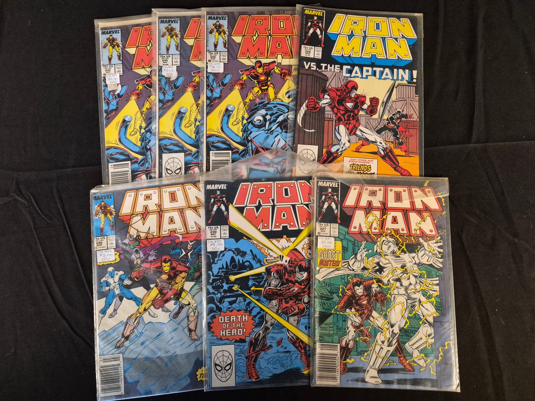 BID PER WHAT YOU SEE IN THE PHOTO, NOT THE AI GENERATED TITLES AND DESCRIPTIONS! A group of vintage Marvel Comics Iron Man comic books from the 1968 series, Volume 1, published by Marvel Comics in the late 1980s. The collection includes issue numbers 228, 230, 231, 240, and 245. The issues feature a 75-cent original cover price. The cover art includes dynamic illustrations of the character in various suits of armor with featured titles such as VS. THE CAPTAIN!, DEATH OF THE HERO!, and GHOST BUSTED!. The comics are stored in individual protective plastic sleeves.