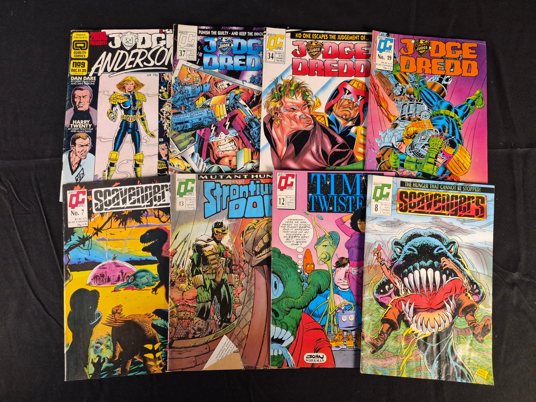 BID PER WHAT YOU SEE IN THE PHOTO, NOT THE AI GENERATED TITLES AND DESCRIPTIONS! A collection of vintage science fiction comic books published by Quality Comics during the mid-to-late 1980s. The group features various titles including Judge Anderson, Judge Dredd, Scavengers, Strontium Dog, and Time Twisters. Visible issue numbers include Judge Anderson No. 9, Judge Dredd No. 19, 34, and 37, Scavengers No. 7 and 8, Strontium Dog No. 13, and Time Twisters No. 12. Each comic is printed on paper with color illustrative cover art and displays price markings for the US, Canada, and the UK. These issues represent North American reprints of material originally appearing in the British publication 2000 AD.