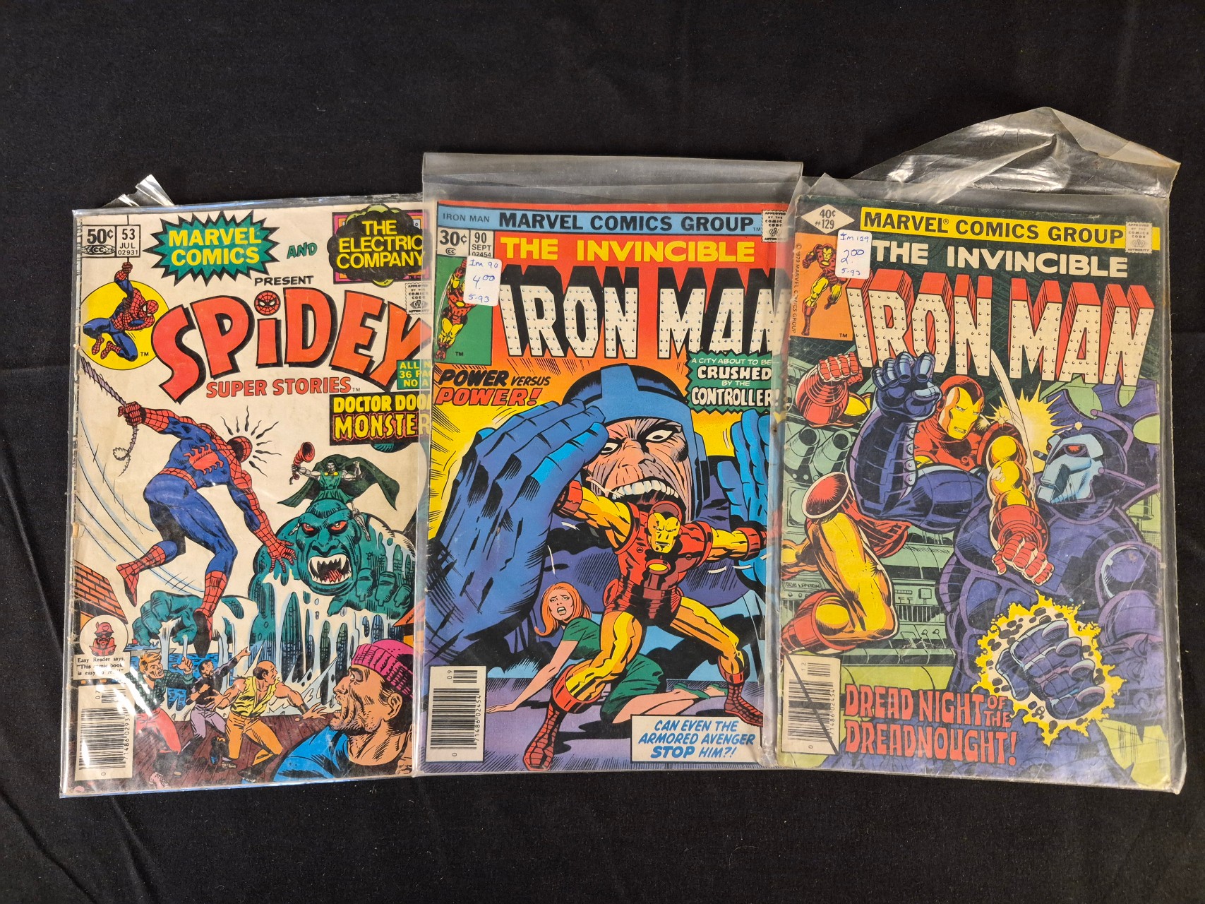 BID PER WHAT YOU SEE IN THE PHOTO, NOT THE AI GENERATED TITLES AND DESCRIPTIONS! A trio of vintage Marvel comic books from the Bronze Age. The collection includes Spidey Super Stories issue number 53 (July 1981) featuring Doctor Doom’s Monster, The Invincible Iron Man issue number 90 (September 1976) titled Power Versus Power!, and The Invincible Iron Man issue number 129 (December 1979) featuring Dread Knight of the Dreadnought!. These paper-based periodicals feature original cover prices of 30 cents, 40 cents, and 50 cents. Each comic is presented in a protective plastic sleeve.
