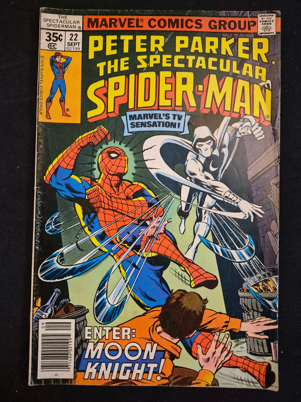 BID PER WHAT YOU SEE IN THE PHOTO, NOT THE AI GENERATED TITLES AND DESCRIPTIONS! Peter Parker, The Spectacular Spider-Man issue number 22, published by Marvel Comics Group and dated September 1978. This stapled newsprint comic book features cover art credited to Cockrum and Rubinstein, depicting Spider-Man in combat with Moon Knight. The cover includes the printed text ENTER: MOON KNIGHT! and MARVEL’S TV SENSATION!. This 35-cent newsstand issue displays the Comics Code Authority seal in the upper right and a UPC barcode in the lower-left corner.