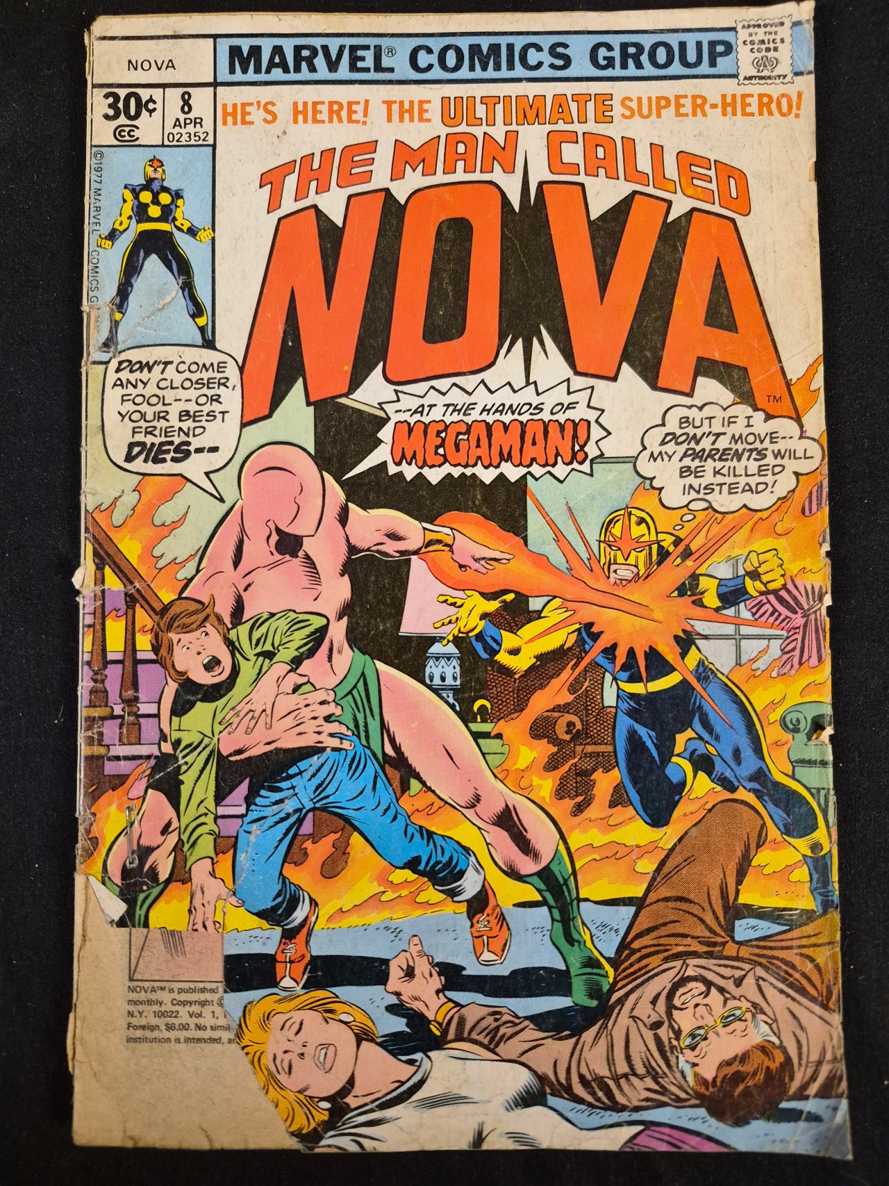 BID PER WHAT YOU SEE IN THE PHOTO, NOT THE AI GENERATED TITLES AND DESCRIPTIONS! This is a vintage Bronze Age comic book published by the Marvel Comics Group, titled The Man Called Nova, issue number 8, dated April 1977. The cover art depicts the title character, Nova, in a confrontation with the antagonist Megaman, alongside several other figures and dialogue bubbles. The publication details are visible in the top left corner, indicating a 30-cent price point and the issue number, while the Comics Code Authority seal appears in the top right. The publication information at the bottom left indicates it was published monthly by Marvel Comics Group. The item is a printed paper collectible.
