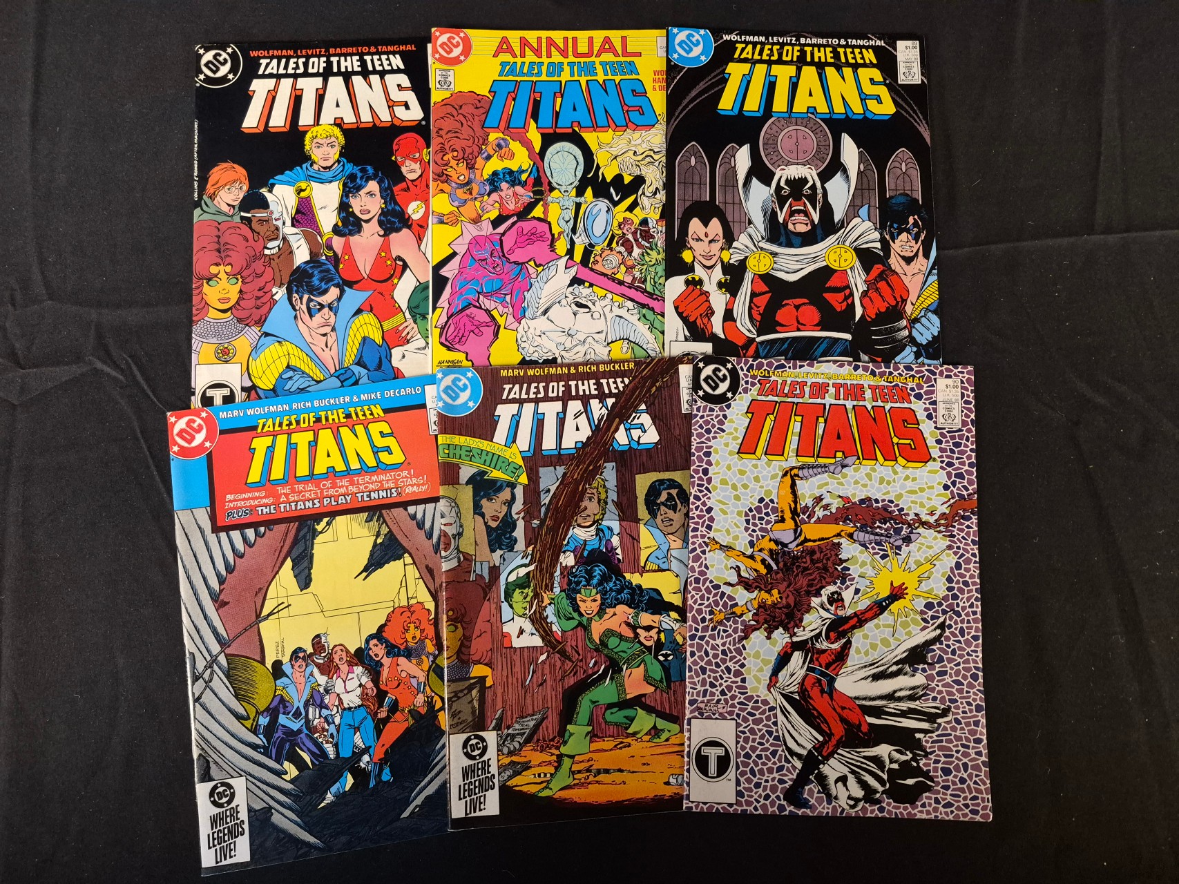 BID PER WHAT YOU SEE IN THE PHOTO, NOT THE AI GENERATED TITLES AND DESCRIPTIONS! This group of mid-1980s DC comic books features several issues from the Tales of the Teen Titans series, including one annual. The collection includes cover art and story credits for creators such as Marv Wolfman, George Perez, Rich Buckler, and Mike DeCarlo. Notable cover text highlights story arcs including The Trial of the Terminator! and The Lady’s Name is Cheshire!. The comics are constructed of paper with staple bindings and feature full-color cover illustrations.