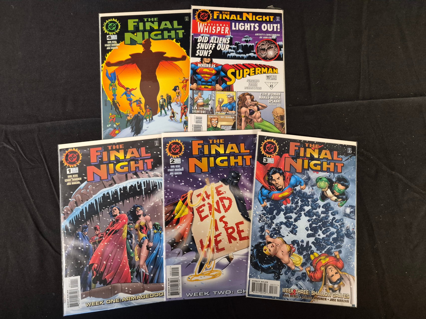 BID PER WHAT YOU SEE IN THE PHOTO, NOT THE AI GENERATED TITLES AND DESCRIPTIONS! A group of DC Comics The Final Night (1996) comic books. The collection includes the limited series and a tie-in issue of Superman number 117. These Modern Age publications are standard-format paper comics featuring illustrated cover art. Creative credits for the series include Karl Kesel, Stuart Immonen, Jose Marzan, Dan Jurgens, Ron Frenz, and Joe Rubinstein. The covers depict various characters from the DC Universe, including Superman, Batman, Wonder Woman, and Green Lantern. The issues are titled by week, including Week One: Armageddon, Week Two: Chaos, and Week Three: Shallow Graves.