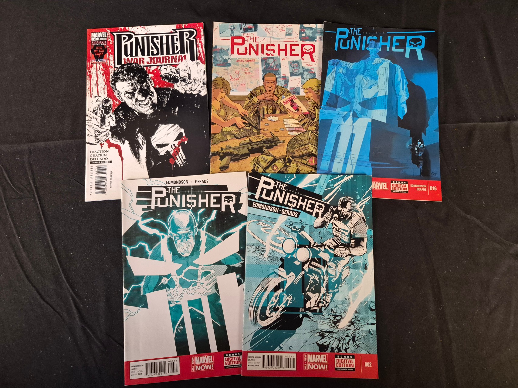 BID PER WHAT YOU SEE IN THE PHOTO, NOT THE AI GENERATED TITLES AND DESCRIPTIONS! A group of modern-era Marvel comic books featuring the character The Punisher. The collection includes Punisher War Journal issue 17 dated 2008 and several issues from the All-New Marvel Now series, specifically issues 2, 6, and 16. The books feature work by creators Nathan Edmondson, Mitch Gerads, Matt Fraction, and Howard Chaykin. Each item is printed on standard comic stock with full-color illustrative covers. Visible markings include issue numbers, barcodes, and promotional Bonus Digital Edition banners.