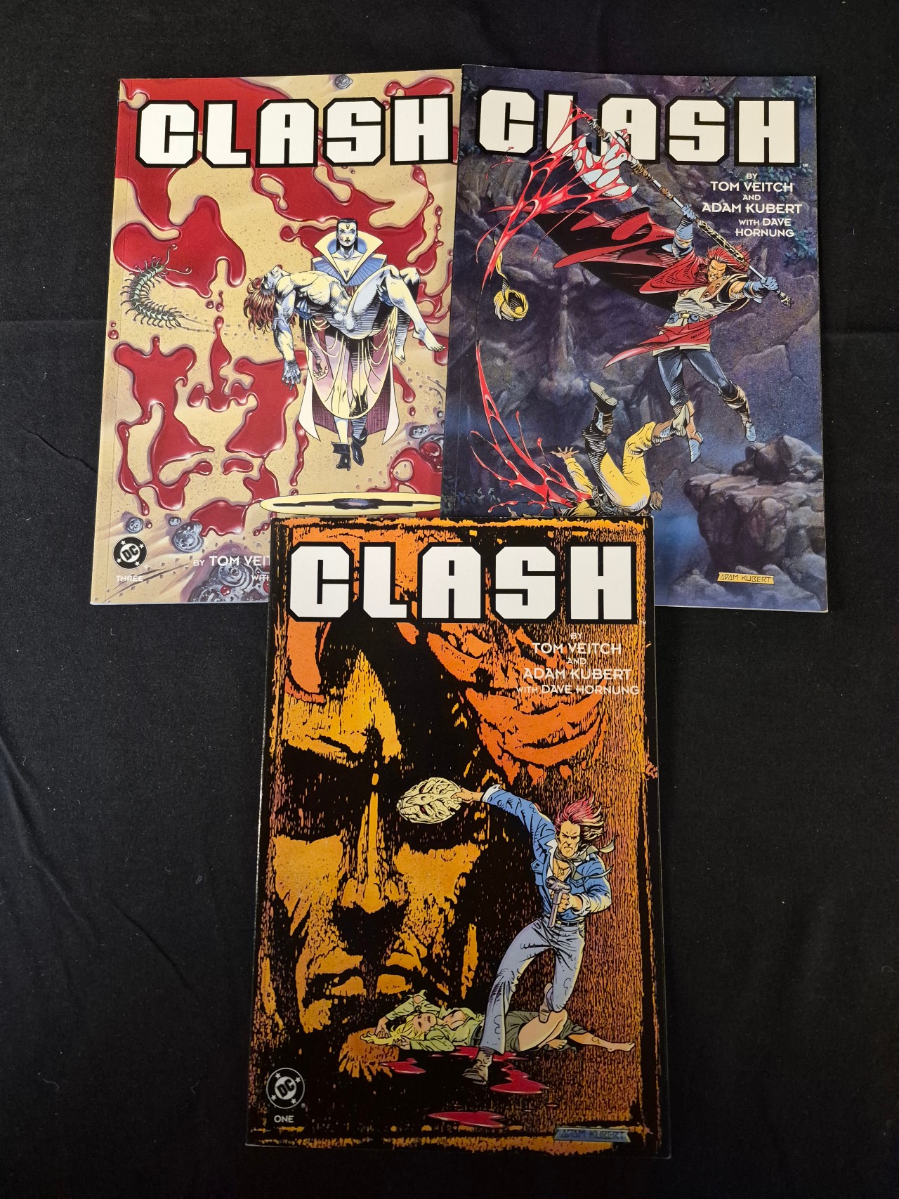 BID PER WHAT YOU SEE IN THE PHOTO, NOT THE AI GENERATED TITLES AND DESCRIPTIONS! A trio of comic books from the series Clash, published by DC Comics in 1991. The collection includes issues identified as Book One and Book Three. The covers attribute the stories and artwork to Tom Veitch and Adam Kubert, with colors by Dave Hornung. Each issue is printed on standard paper stock and features the DC Comics insignia. The covers display the title Clash in large block lettering alongside character illustrations.