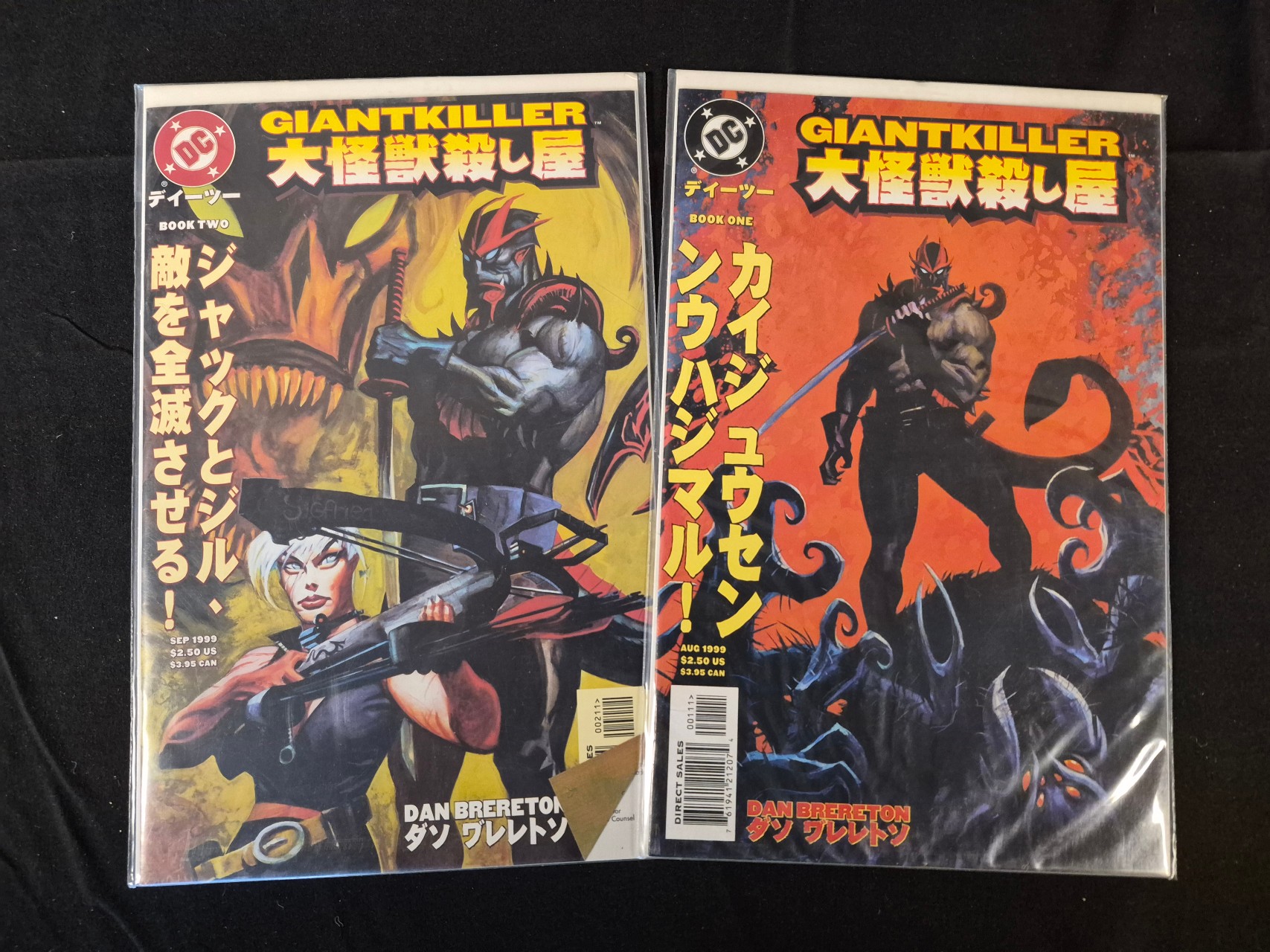 BID PER WHAT YOU SEE IN THE PHOTO, NOT THE AI GENERATED TITLES AND DESCRIPTIONS! A pair of comic books from the Giantkiller series, written and illustrated by Dan Brereton and published by DC Comics in 1999. The lot includes Book One (August 1999) and Book Two (September 1999). Both issues feature painted cover art depicting monstrous figures and characters in combat poses. The covers incorporate both English and Japanese text, including the series title Daikaiju Koroshiya (Giant Monster Killer) and promotional phrases such as Kaijuu Sensou Hajimaru! (The monster war begins!) and Jakku to Jiru, teki o zenmetsu saseru! (Jack and Jill, annihilate the enemy!). Each comic is printed on standard paper stock with color illustrations throughout.