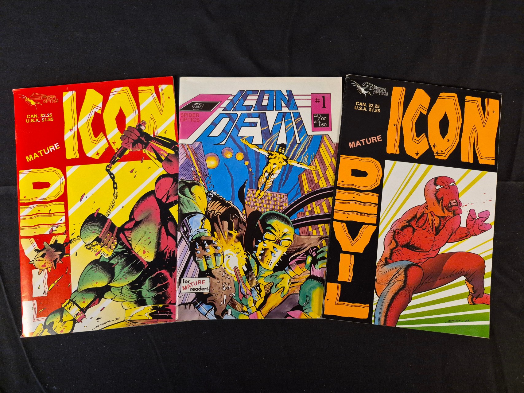 BID PER WHAT YOU SEE IN THE PHOTO, NOT THE AI GENERATED TITLES AND DESCRIPTIONS! A trio of independent comic books from the Icon Devil series published by Spider Optics. The collection includes issue number one. The covers are printed with stylized illustrations and include mature reader labels. Pricing is listed in both US and Canadian denominations. One issue features a signature and the date 89 on the cover art. The items are constructed of printed paper.
