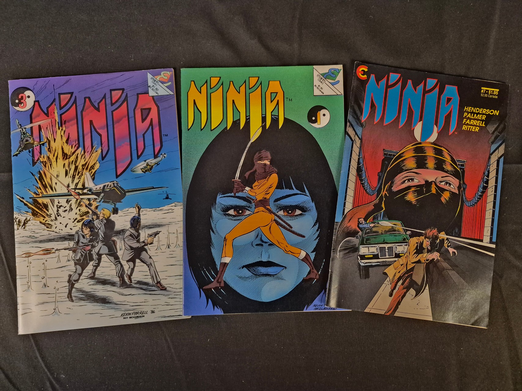 BID PER WHAT YOU SEE IN THE PHOTO, NOT THE AI GENERATED TITLES AND DESCRIPTIONS! A trio of vintage comic books from the Ninja series published by Eternity Comics during the mid-to-late 1980s. The collection includes issue numbers one, three, and seven. These staple-bound paper publications feature action-oriented cover illustrations characteristic of the era. Issue number three displays artist credits for Kevin Farrell and Roy Richardson with a 1986 date. Issue number seven lists credits for Henderson, Palmer, Farrell, and Ritter. The covers include the Eternity Comics logo and original retail pricing in both US and Canadian dollars.