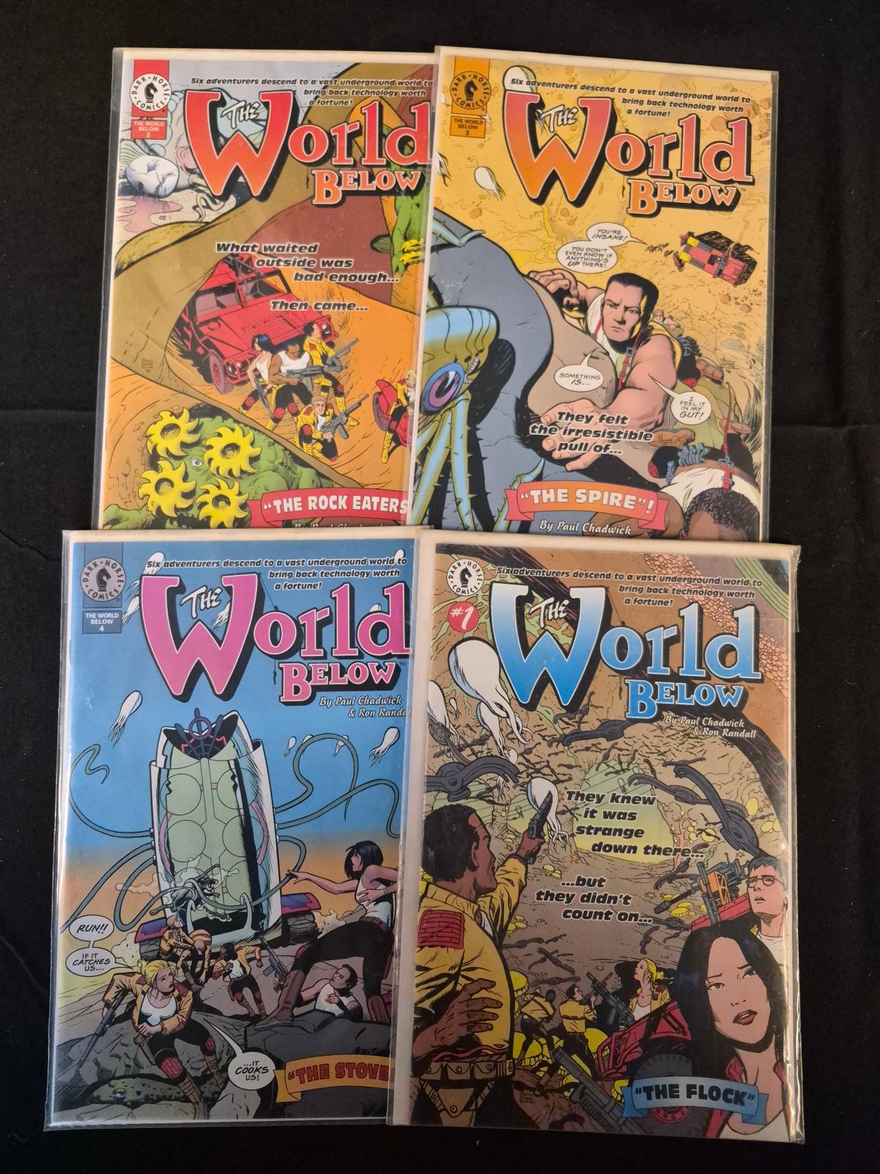 BID PER WHAT YOU SEE IN THE PHOTO, NOT THE AI GENERATED TITLES AND DESCRIPTIONS! This set of modern comic books features the complete four-issue run of The World Below, published by Dark Horse Comics in 1999. The series features credits to Paul Chadwick and Ron Randall, illustrating a science fiction adventure narrative. The collection includes the titles The Flock, The Rock Eaters, The Spire!, and The Stove. Each issue is printed on paper and is housed individually within a protective clear plastic sleeve with a backing board. The cover art depicts various creatures and characters consistent with the series theme.