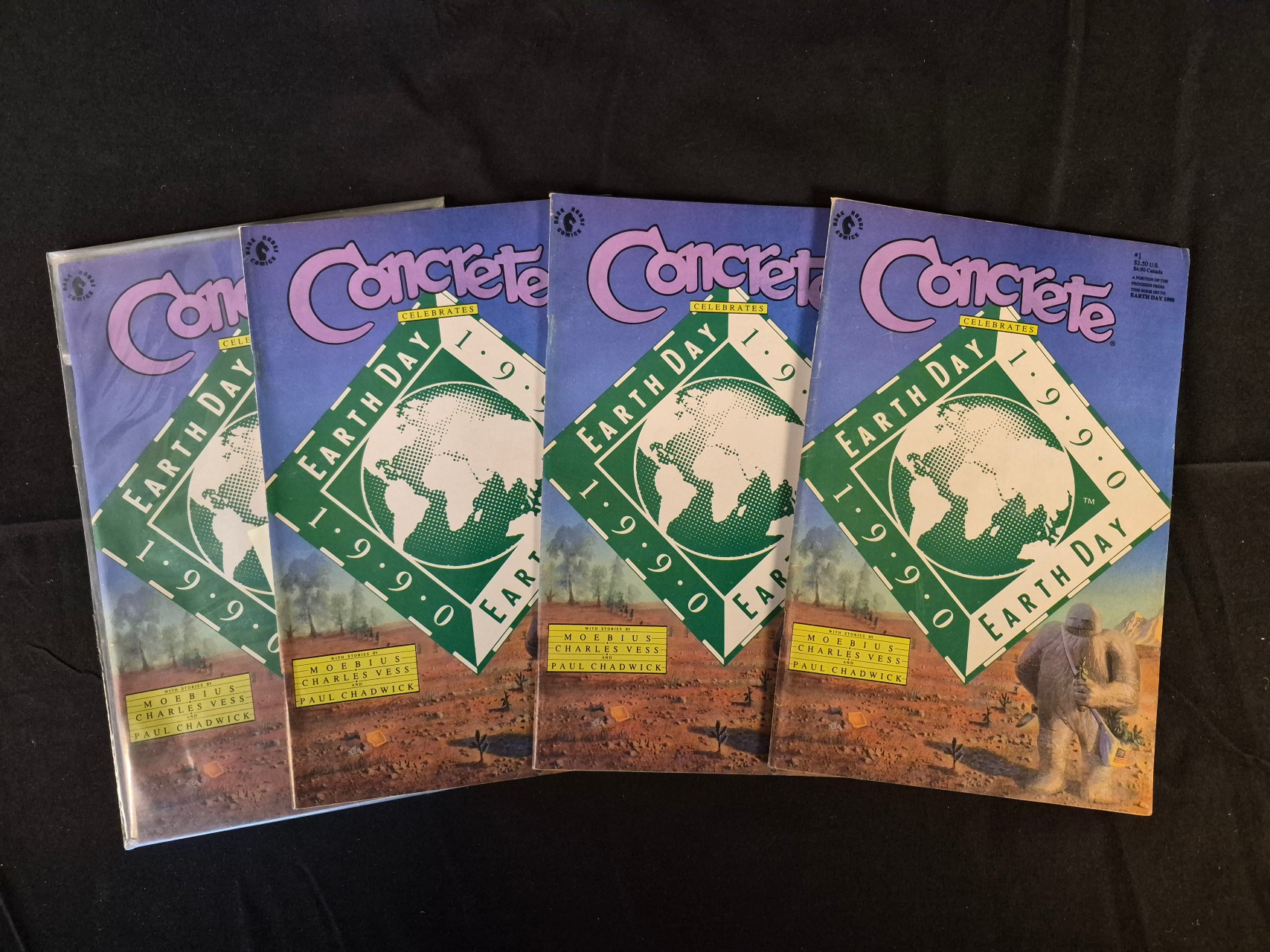 BID PER WHAT YOU SEE IN THE PHOTO, NOT THE AI GENERATED TITLES AND DESCRIPTIONS! A collection of Concrete Celebrates Earth Day 1990 comic books published by Dark Horse Comics. These Modern Age publications are identified as issue number 1 and feature stories and artwork by Paul Chadwick, Moebius, and Charles Vess. The cover design includes a centralized green Earth Day diamond logo over a desert landscape featuring the character Concrete. Each comic includes the Dark Horse logo in the upper left and the 3.50 US dollar price point in the upper right.