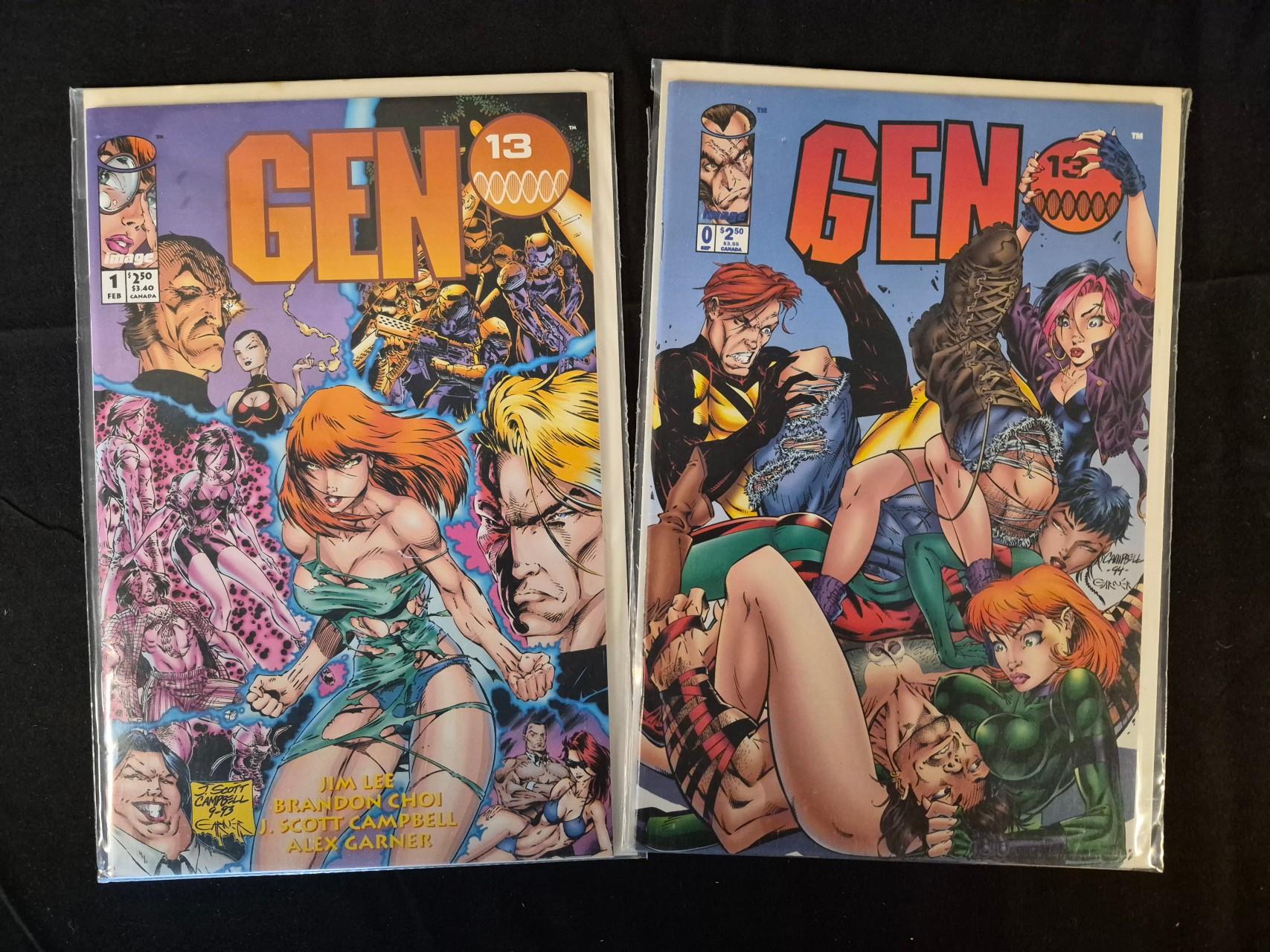 BID PER WHAT YOU SEE IN THE PHOTO, NOT THE AI GENERATED TITLES AND DESCRIPTIONS! A pair of modern-age comic books from the Gen 13 series published by Image Comics in 1994. This lot consists of issue number 1, dated February, and issue number 0, dated September. Both issues feature cover art by J. Scott Campbell and Alex Garner, with series credits for Jim Lee and Brandon Choi. The publications are full-color comic books with a printed cover price of $2.50. Each item is presented in a protective plastic sleeve with a white backing board.